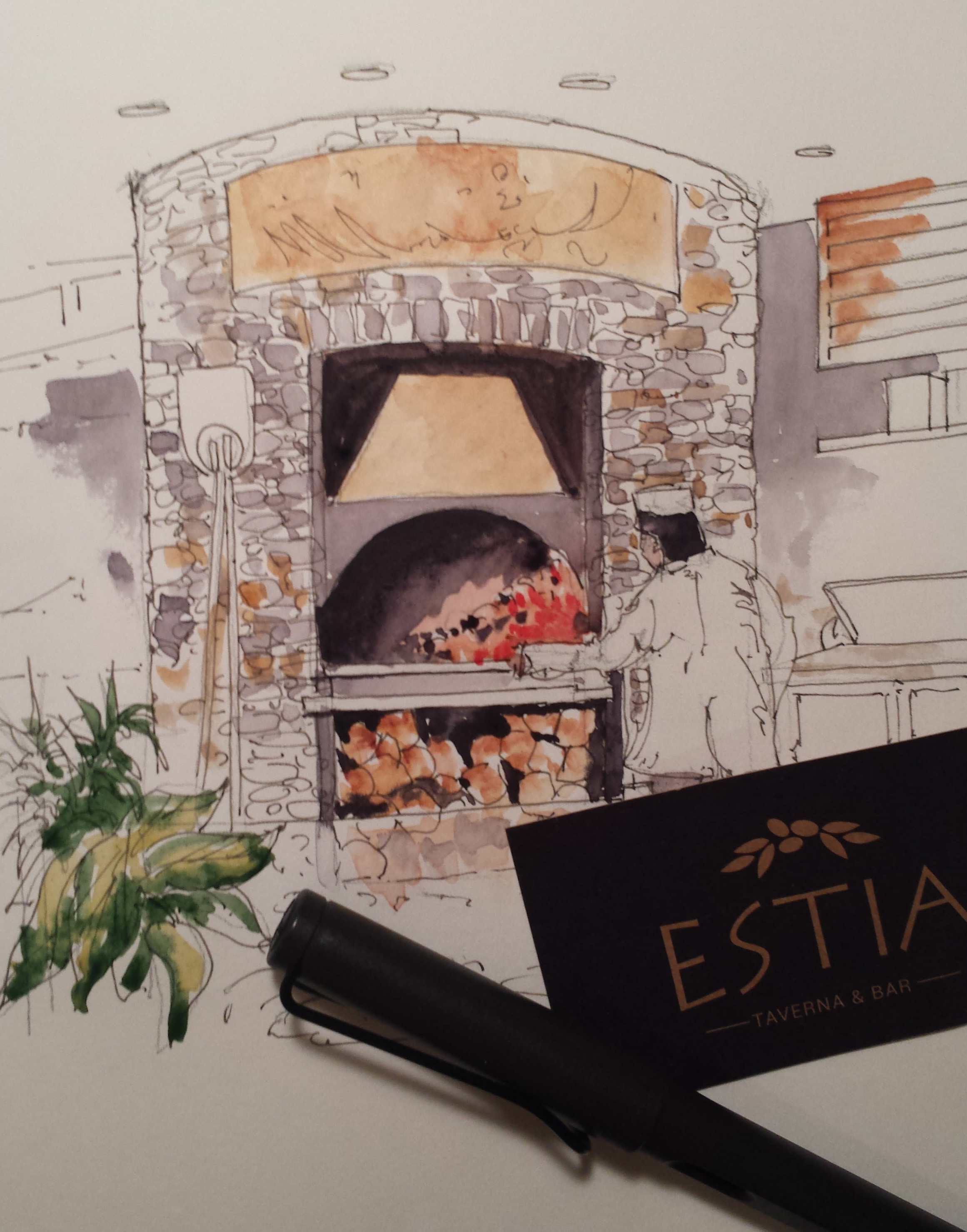 Great Birthday Dinner for my wife Lisa and her Dad John. Both March babies. We enjoyed a fantastic Greek Dinner at Estia Taverna in Mashpee Commons, MA. A quick sketch of the coal fired oven at the restaurant. Lamy Fountain Pen with Noodlers Ink and Daniel Smith Watercolors in an Alpha Series Stillman and Birn Sketchbook.