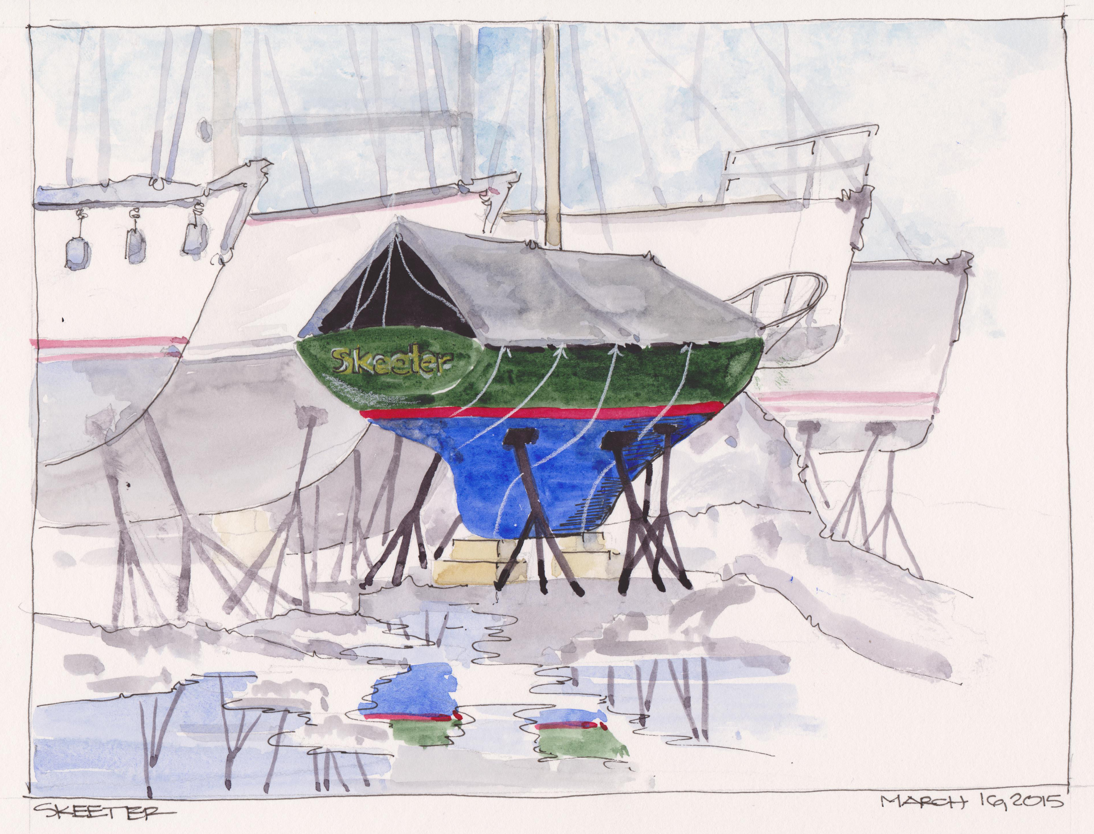 This is a watercolor from a photograph that I snapped over the weekend. Skeeter was a small sailboat undercover in a boatyard in Marion, MA. The colors of Skeeter were a stark contrast to the larger, more monochromatic boats in the background. Watercolor with a pencil sketch under. Once again, I need to learn when to stop in the process. In this case I added the extra ink work that was not needed. Daniel Smith Watercolors, White Charcoal Pencil in an Alpha Series Stillman and Birn Sketchbook.