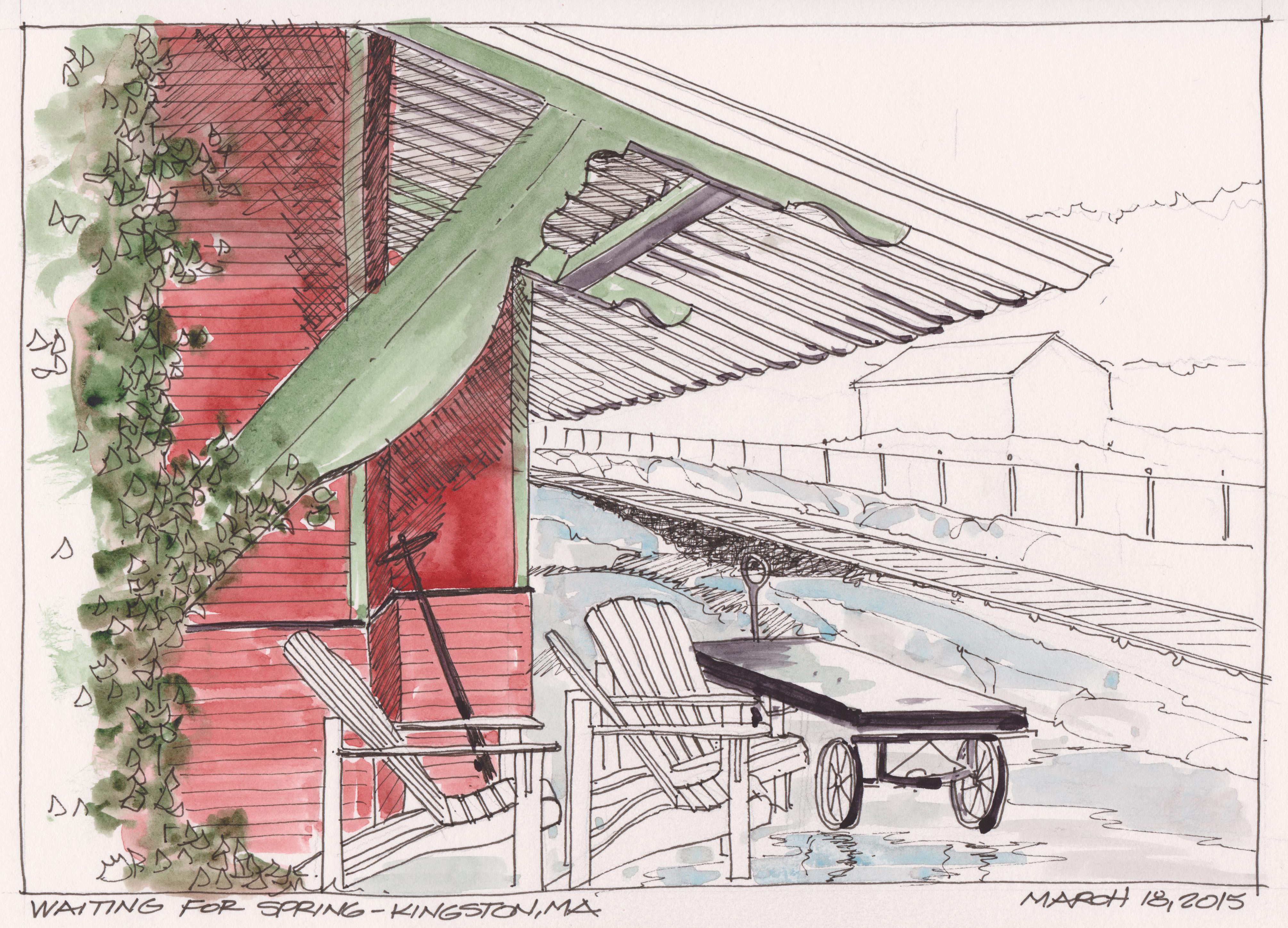 This sketch is based on a photograph taken last week at Soltice Restaurant in Kingston, MA. The Adirondack chairs and old luggage cart appear as if they are waiting for the snow to melt and Spring to arrive along the tracks. This train station was built in 1889 for the Old Colony Railroad. There was passenger service to this station (mostly for the New York, New Haven & Hartford RR, which took over this line in 1893) until 1959. Faber-Castell Pitt Artist Pens in an Alpha Series Stillman and Birn Sketchbook.