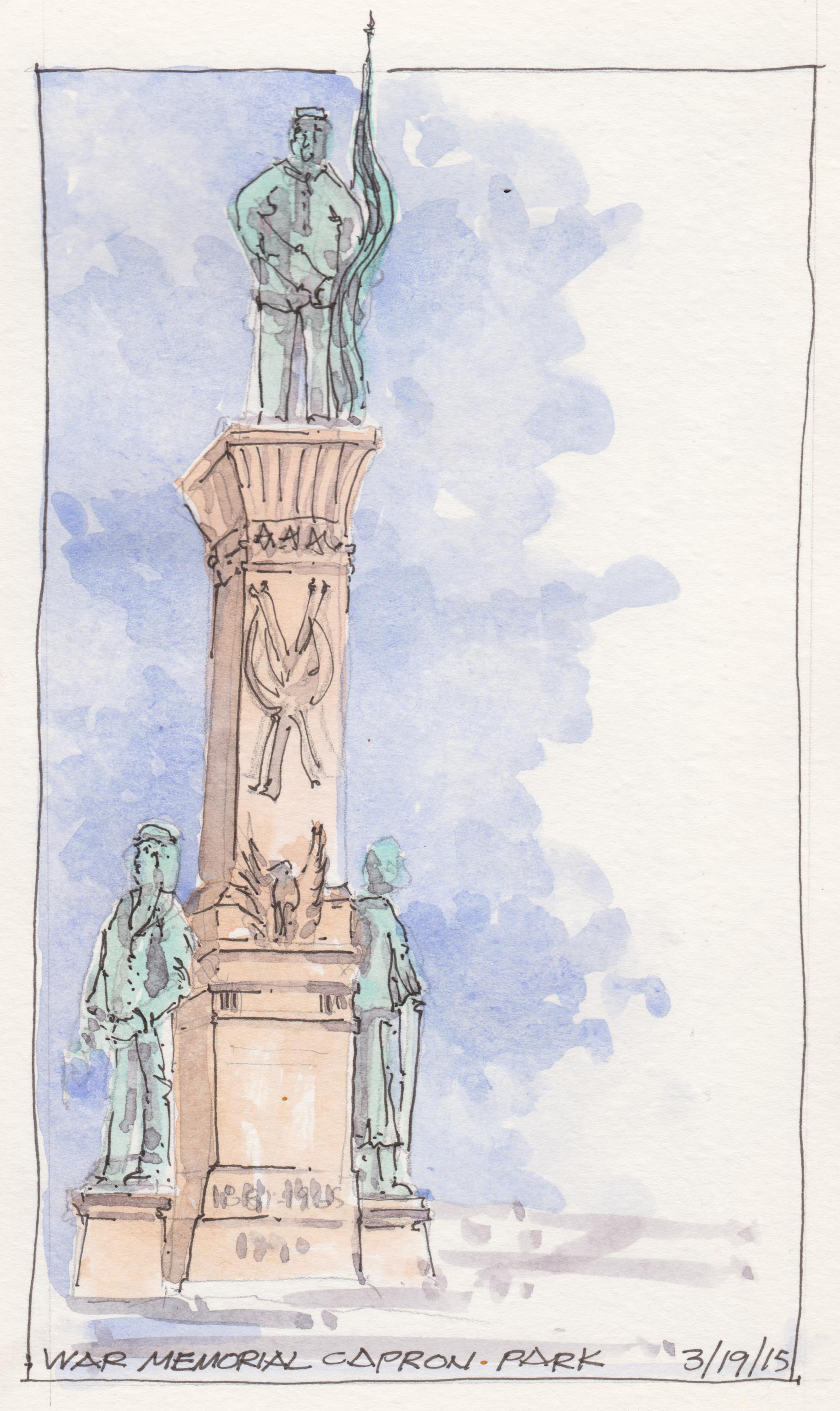 A quick watercolor study of a War Memorial in Capron Park in Attleboro, MA. The bronze figures were beautiful with the patina against the local granite monument. The dates on the memorial were 1863-1965. Daniel Smith Watercolors and ink in a 6″ x 8″ Moleskine Watercolor Book.