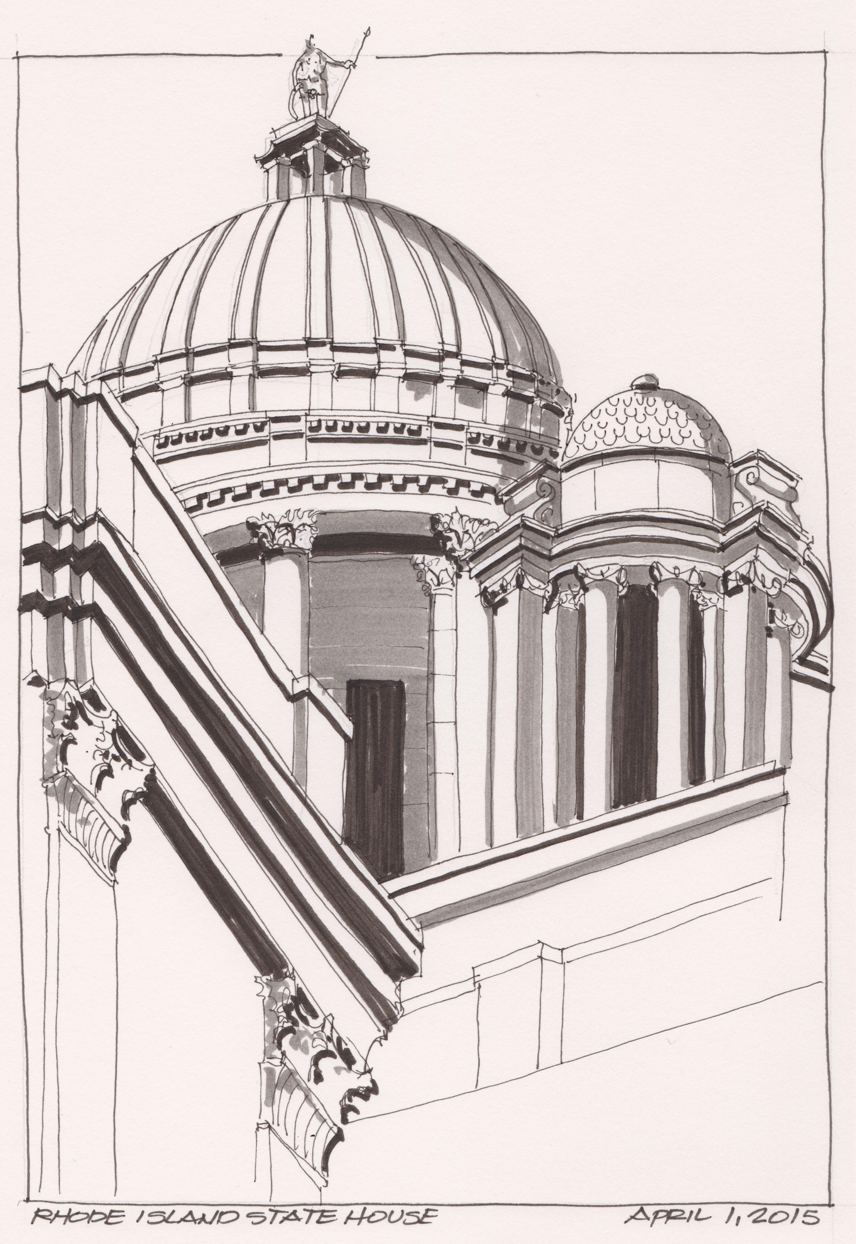 The Rhode Island State House was designed by the architectural firm of McKim, Mead and White and constructed from 1895 to 1904. The dome of the State House is the fourth-largest self-supporting marble dome in the world. On top of the dome is a gold-covered bronze statue of the Independent Man, originally named “Hope”. Another graphic sketch with black and gray Faber-Castell pens in an Alpha Series Stillman and Birn Sketchbook.