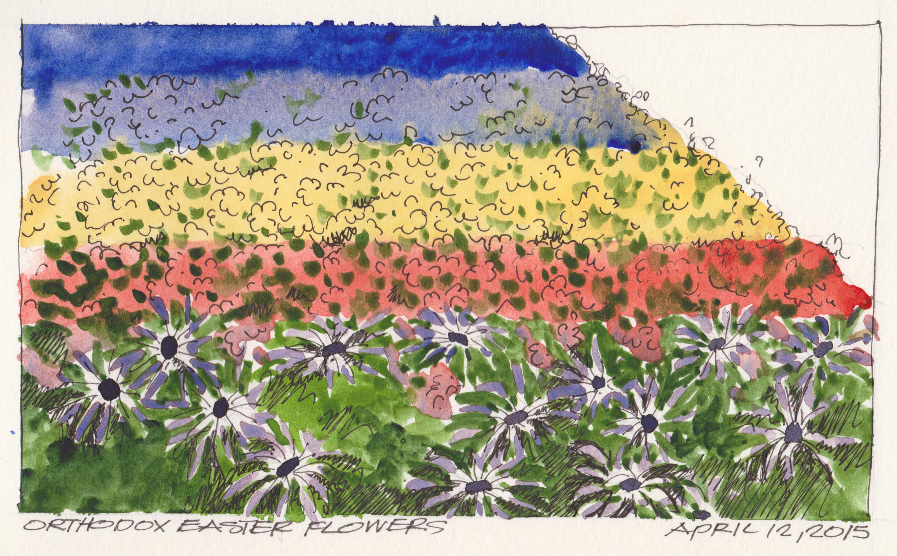 A beautiful day to celebrate Greek Orthodox Easter with my wife Lisa and her family at our house. A wonderfully sunny day with the spring bulbs starting to peak through the soil and the birds chirping in the trees and birdbath. This table of Orange, Yellow, Purple and Blue Pansies along with Dip Dyed Daises was stunning at a local garden center. I did not do the explosion of color justice with my watercolors in a Moleskine Watercolor Sketchbook.