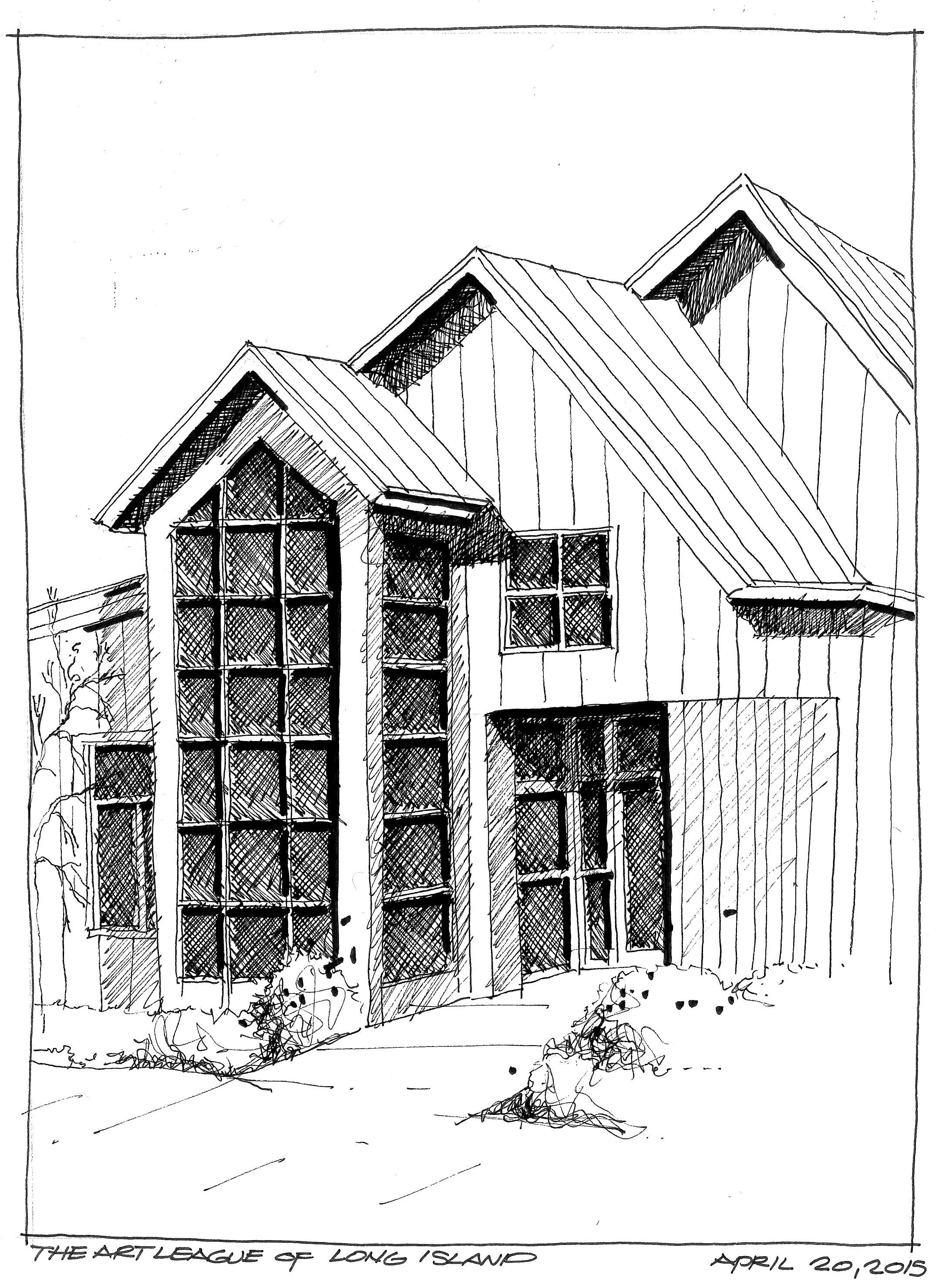 The conclusion of a fantastic 3 day Watercolor Workshop with Thomas Schaller. The Architecture of Light. Tom is a great teacher and presents a great learning opportunity. This is a sketch of the Art League of Long Island in Dix Hills. Faber-Castell Pitt black pens in a Stillman and Birn Alpha series sketchbook.