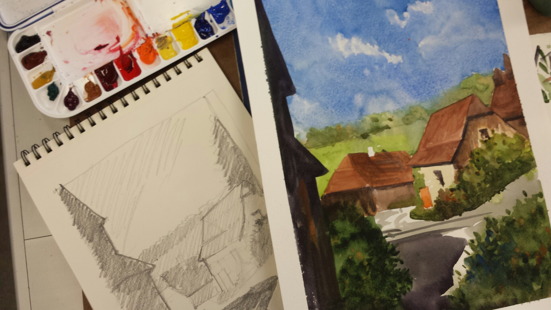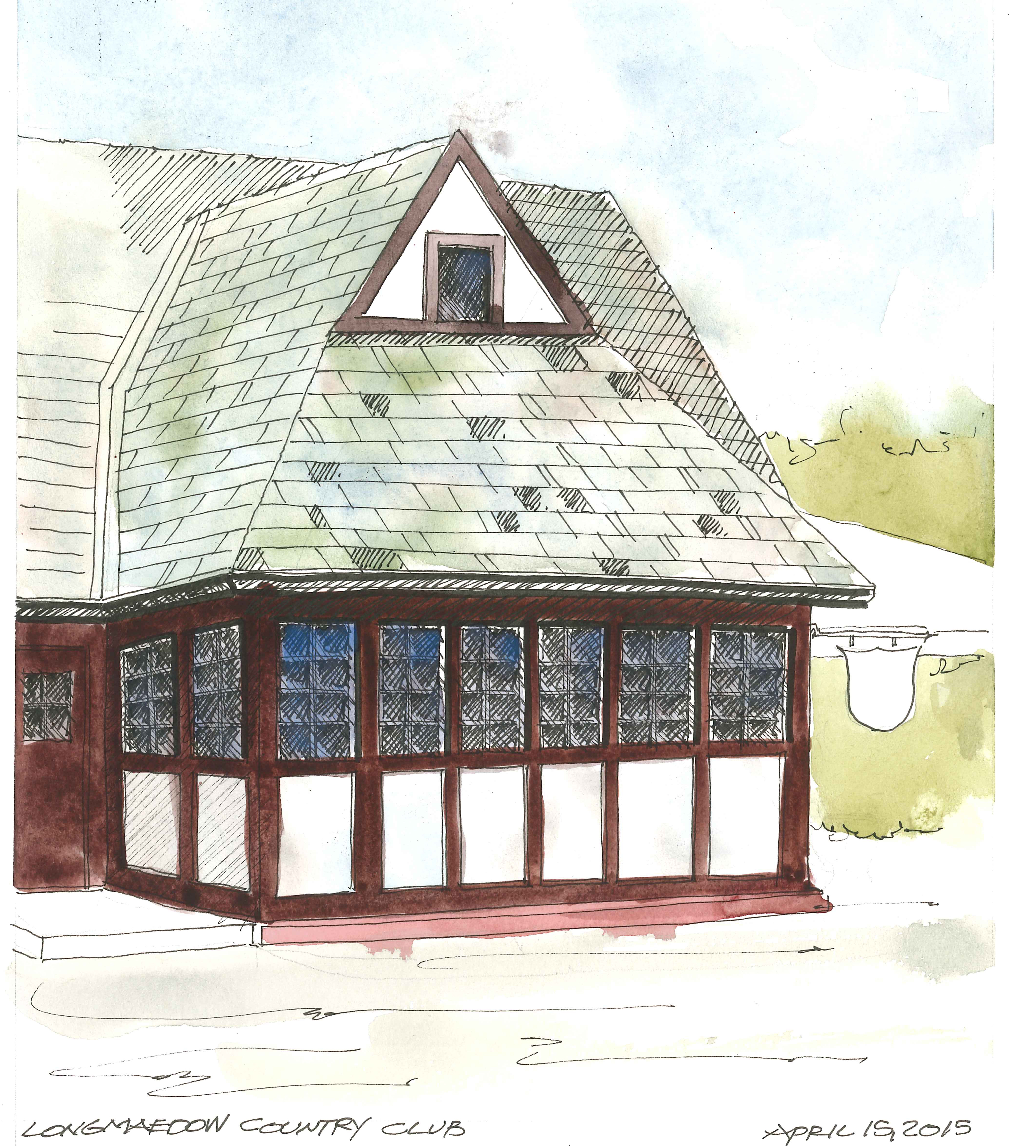 The conclusion of a fantastic 3 day Watercolor Workshop with Thomas Schaller. The Architecture of Light. Tom is a great teacher and presents a great learning opportunity. This is a sketch of the Art League of Long Island in Dix Hills. Faber-Castell Pitt black pens in a Stillman and Birn Alpha series sketchbook.