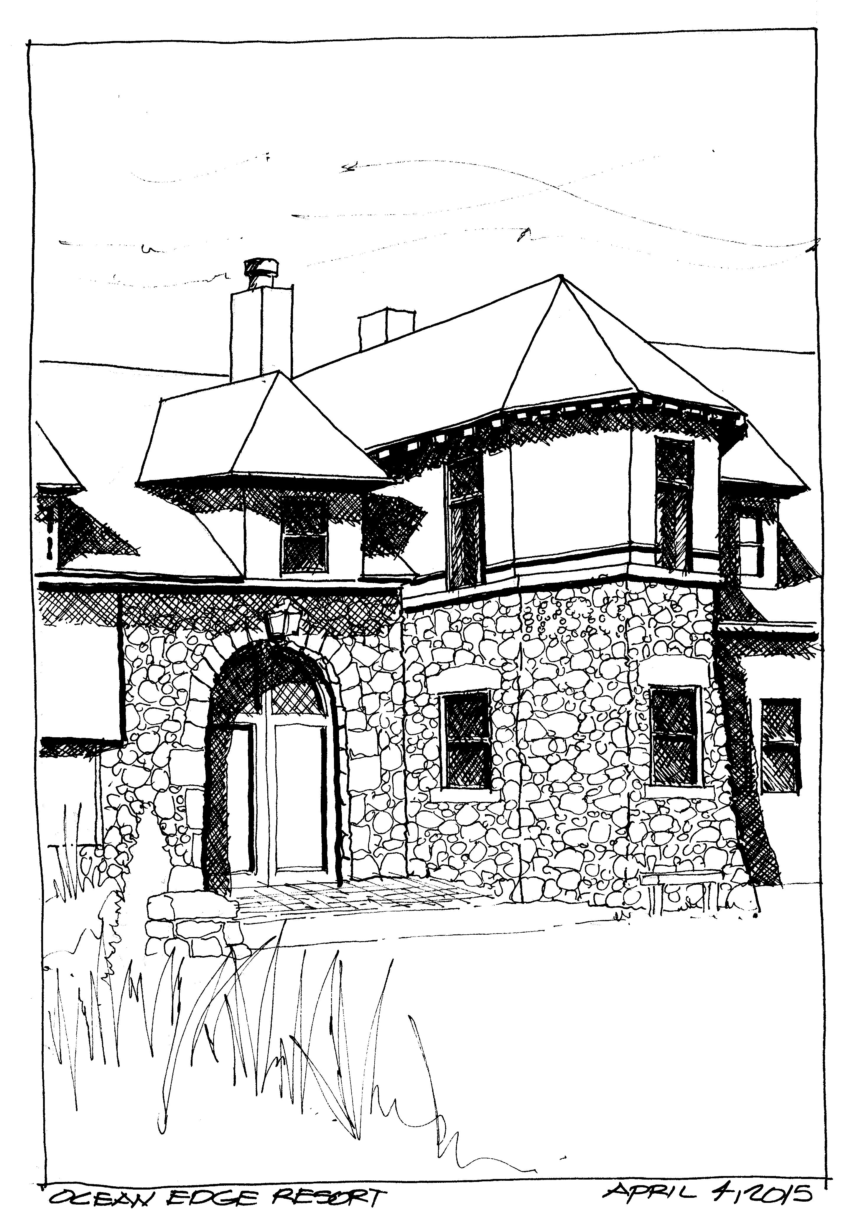 Great road trip to Cape Cod today. The weather is finally turning and a beautiful day for a drive. Ocean Edge dates back to the 1890’s, when Samuel Mayo Nickerson and his wife built their lavish family estate and private game preserve. It was not uncommon for the “Social Event of the Year” to be held at Fieldstone Hall, including visits from President Grover Cleveland. The mansion house, which is listed on the National Register of Historic Places, more closely resembles an English country manor with an eclectic blend of Renaissance Revival and Gothic themes. Faber-Castell Pitt pens in a Stillman and Birn Alpha Sketchbook.