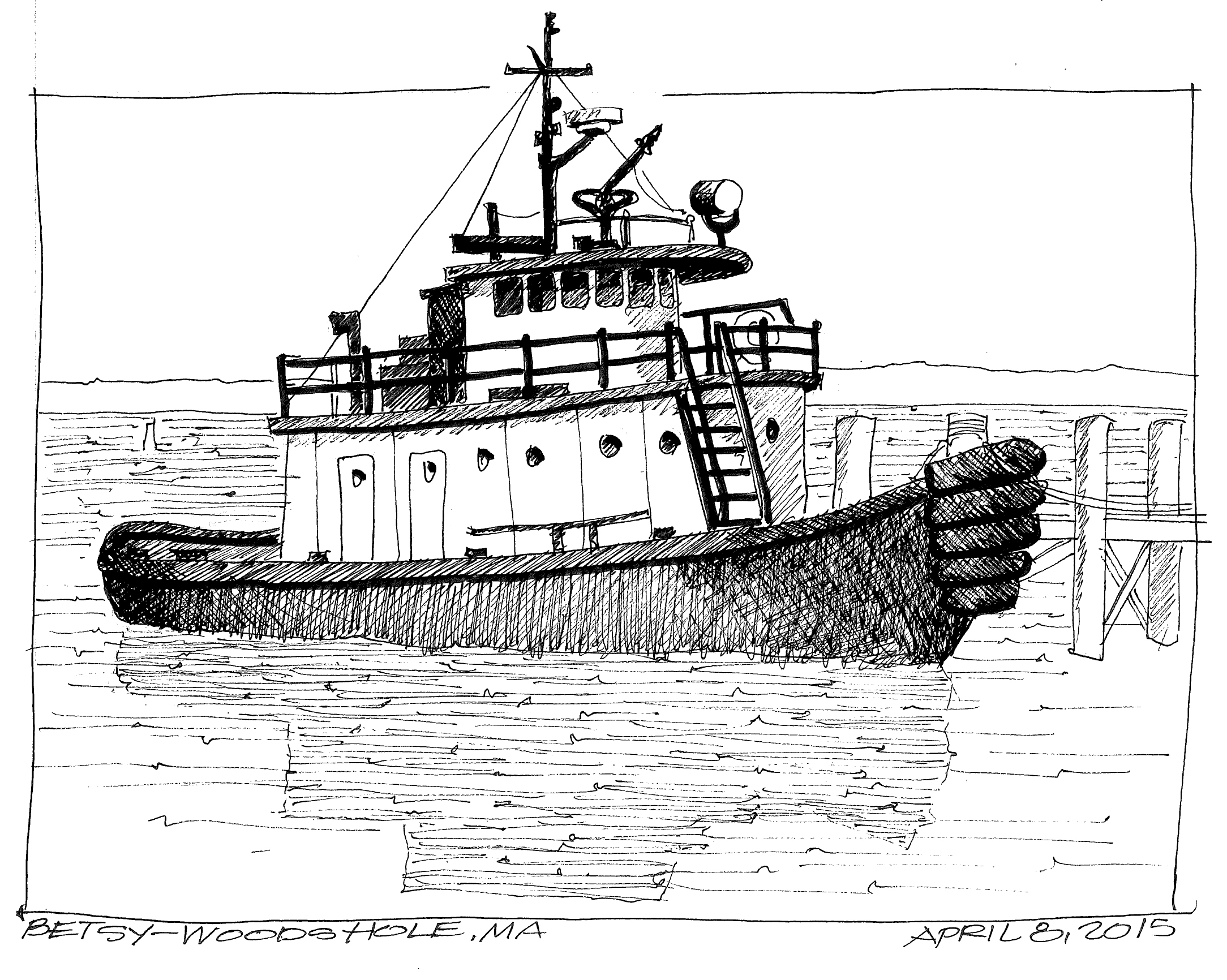 A tugboat (tug) is a boat that maneuvers vessels by pushing or towing them. Tugs move vessels that either should not move themselves, such as ships in a crowded harbor or a narrow canal, or those that cannot move by themselves, such as barges and disabled ships. Tugboats are powerful for their size and strongly built. Betsy is a tug located in the harbor in Woods Hole, Massachusetts. Faber-Castell Pitt pens in a Stillman and Birn Alpha Sketchbook.