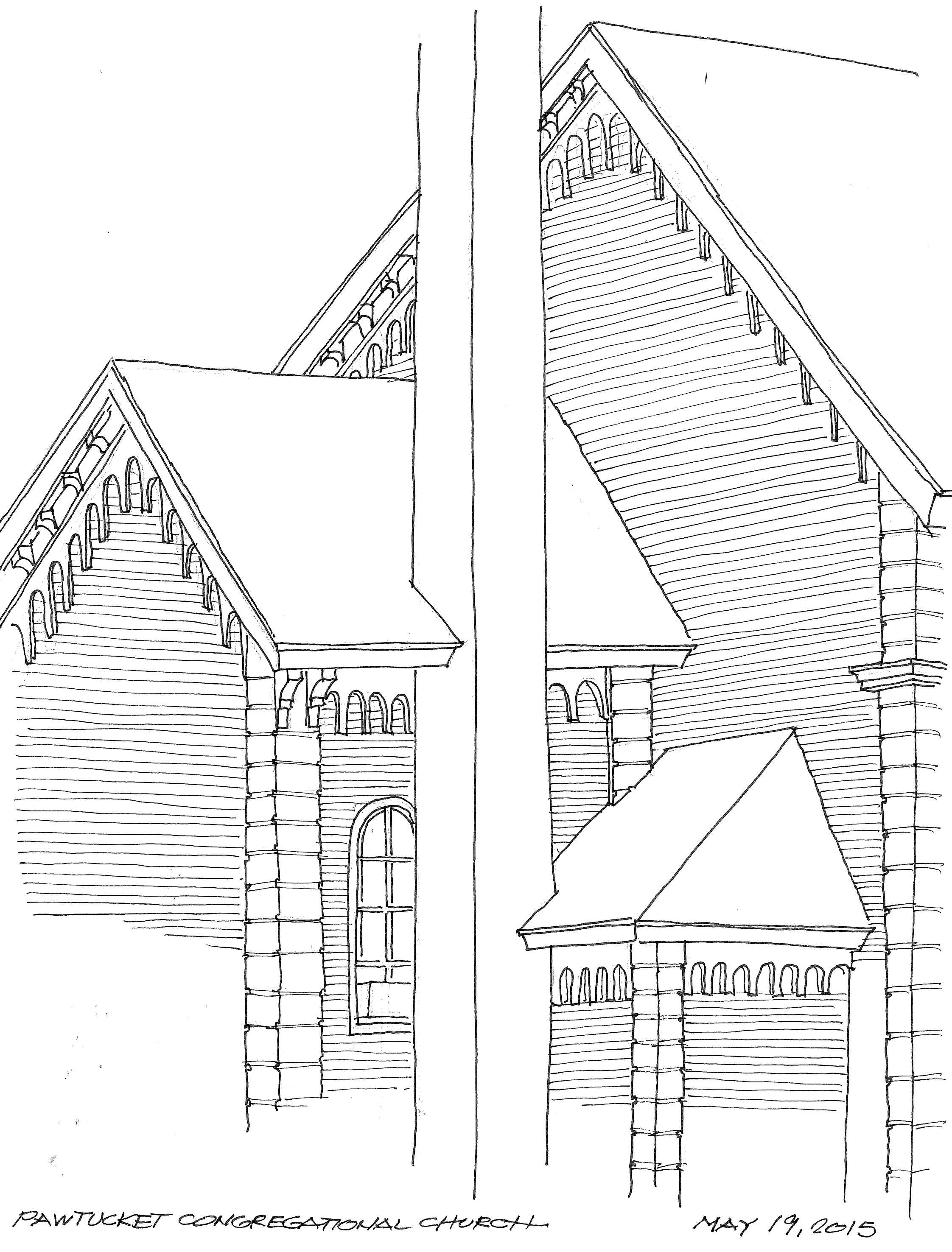 A quick ink sketch of the rear of the Pawtucket Congregational Church in Pawtucket, RI. The Italianate/Romanesque style church building was designed by Boston architect John Stevens and constructed in 1867-1868; it is the only known work of Stevens in Rhode Island. The cost of construction was $64,000. The perspective is a little wonky in this sketch with Faber-Castell Pitt pens in a Stillman and Birn Sketchbook.