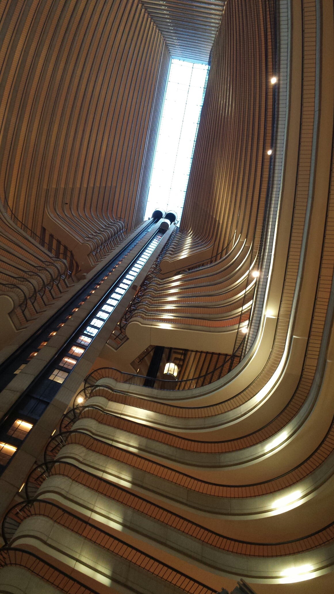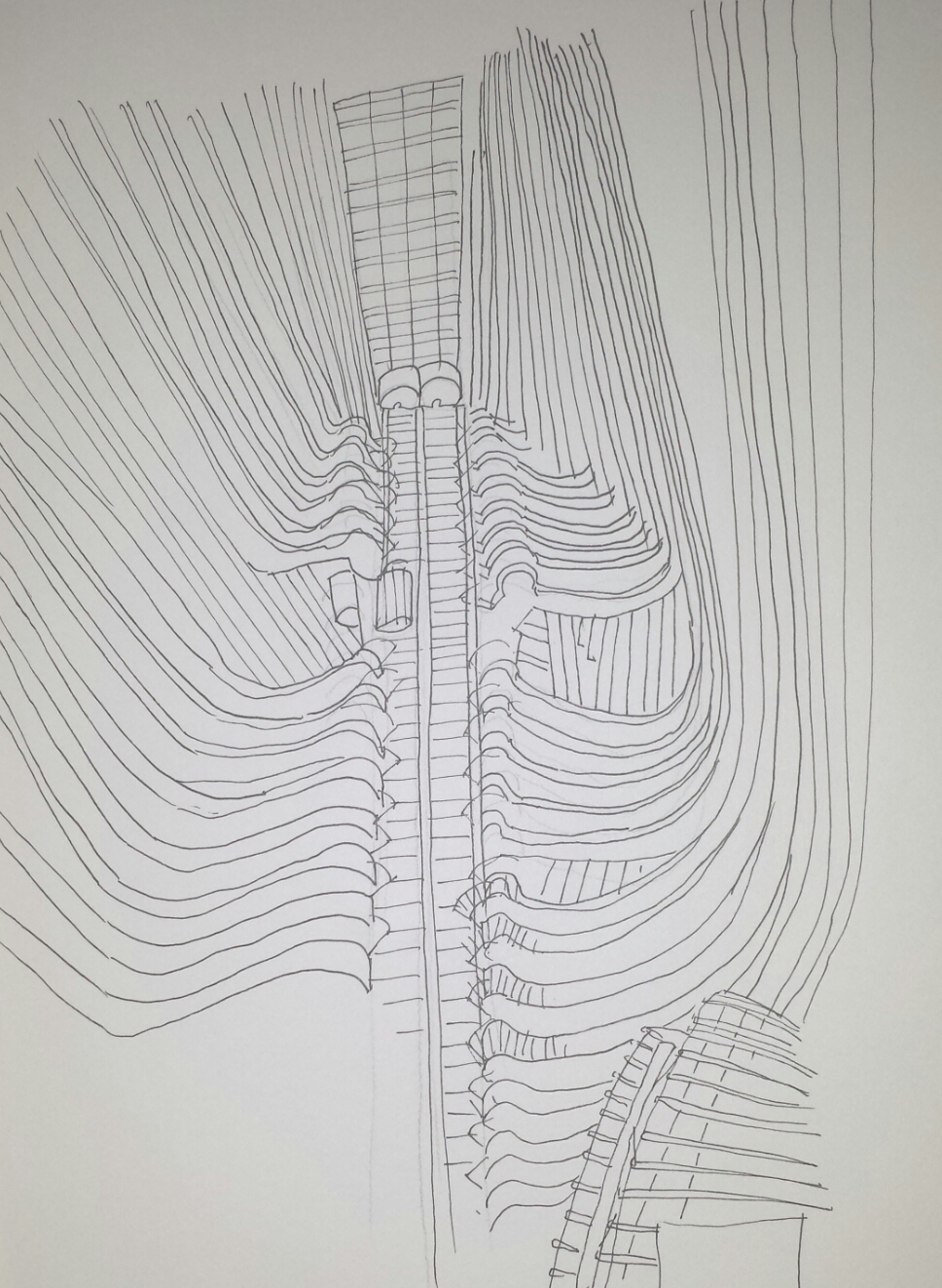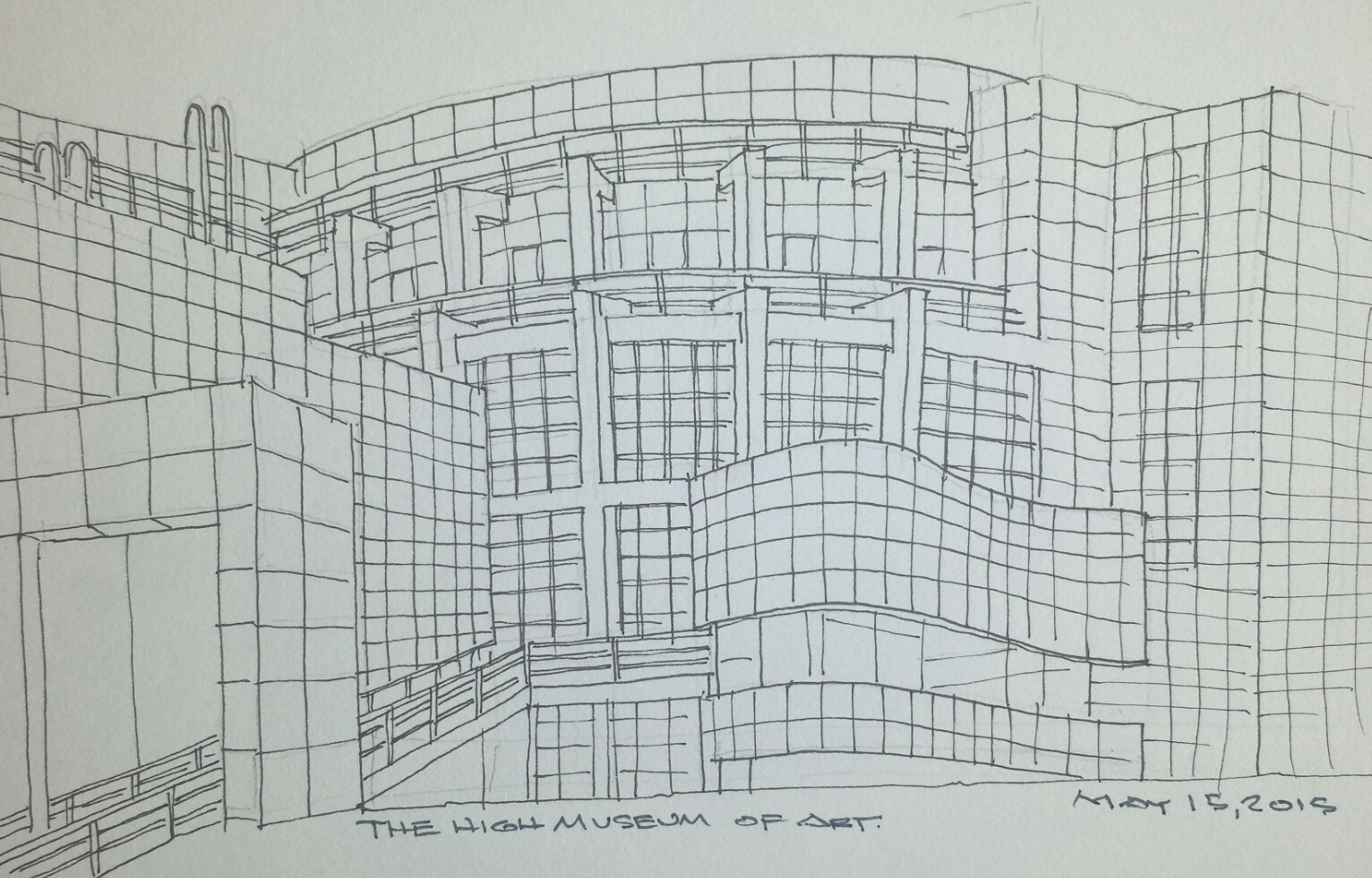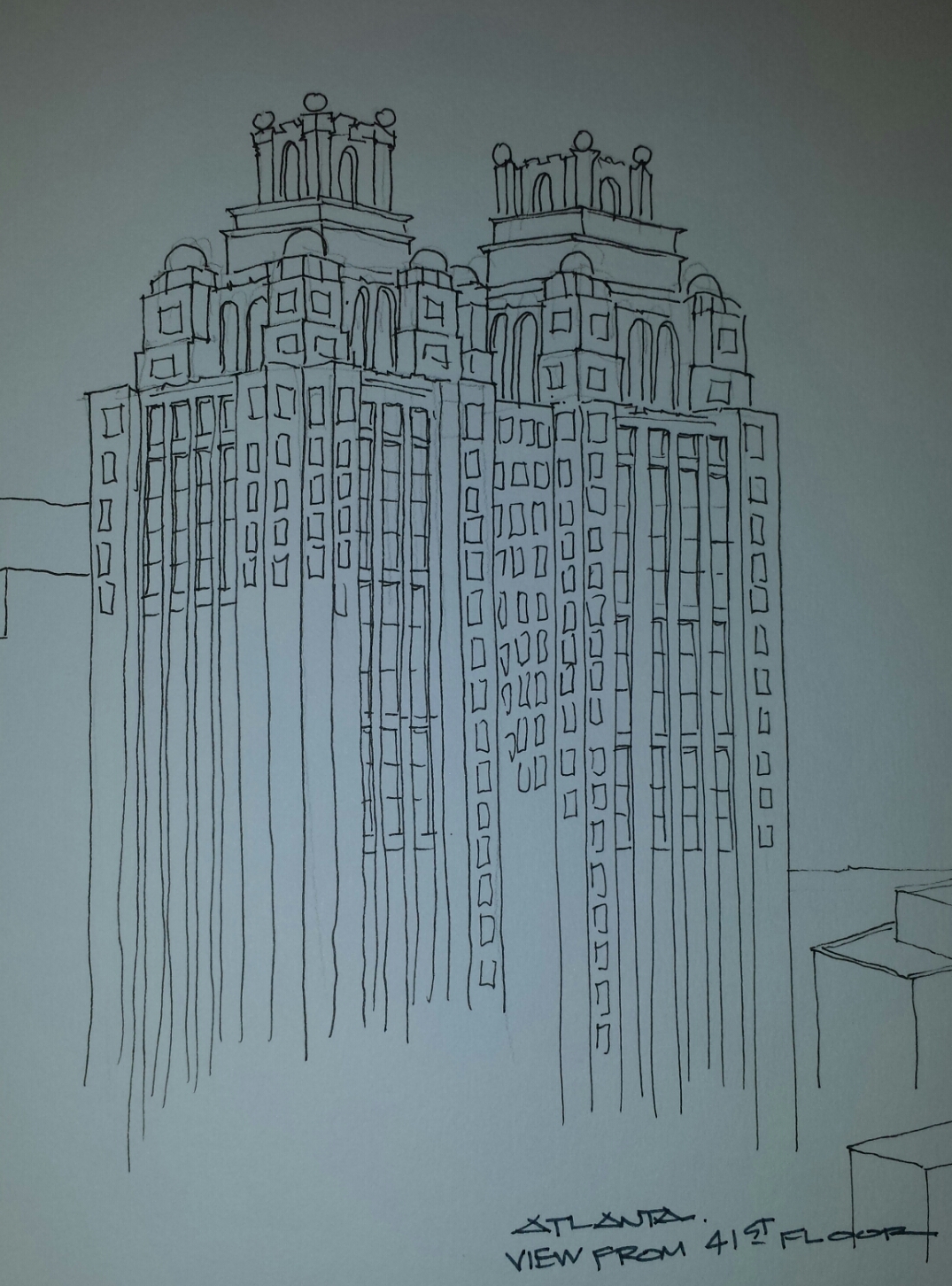 Looking up 52 stories in the atrium of John Portman’s Marriott Marquis in Atlanta. Classic building and first of its kind. There must be 30 vanishing points out more in this view. Also the only straight lines are the glass elevator tracks. Black Faber-Castell Pitt pens in an Alpha Series Stillman and Birn Sketchbook. Below is a photo from a similar angle if you are not familiar with the view.