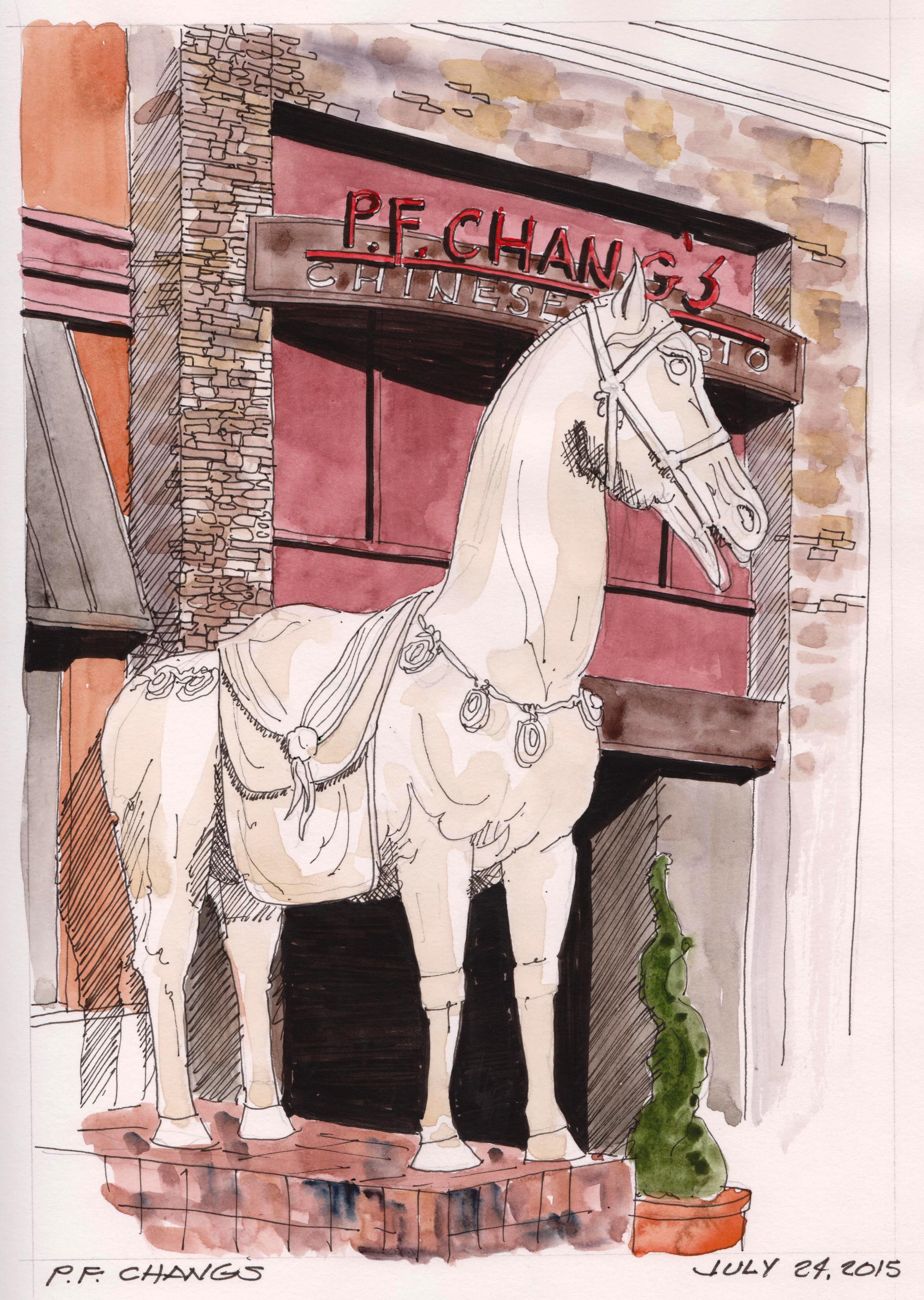 Great dinner at P. F. Chang’s Chinese Bistro. At all their locations they have these great sculptures of Chinese War Horses. Horses in East Asian warfare are inextricably linked with the strategic and tactical evolution of armed conflict. A warrior on horseback or horse-drawn chariot changed the balance of power between civilizations. Watercolors with black art pens in an Alpha Series Stillman and Birn sketchbook.