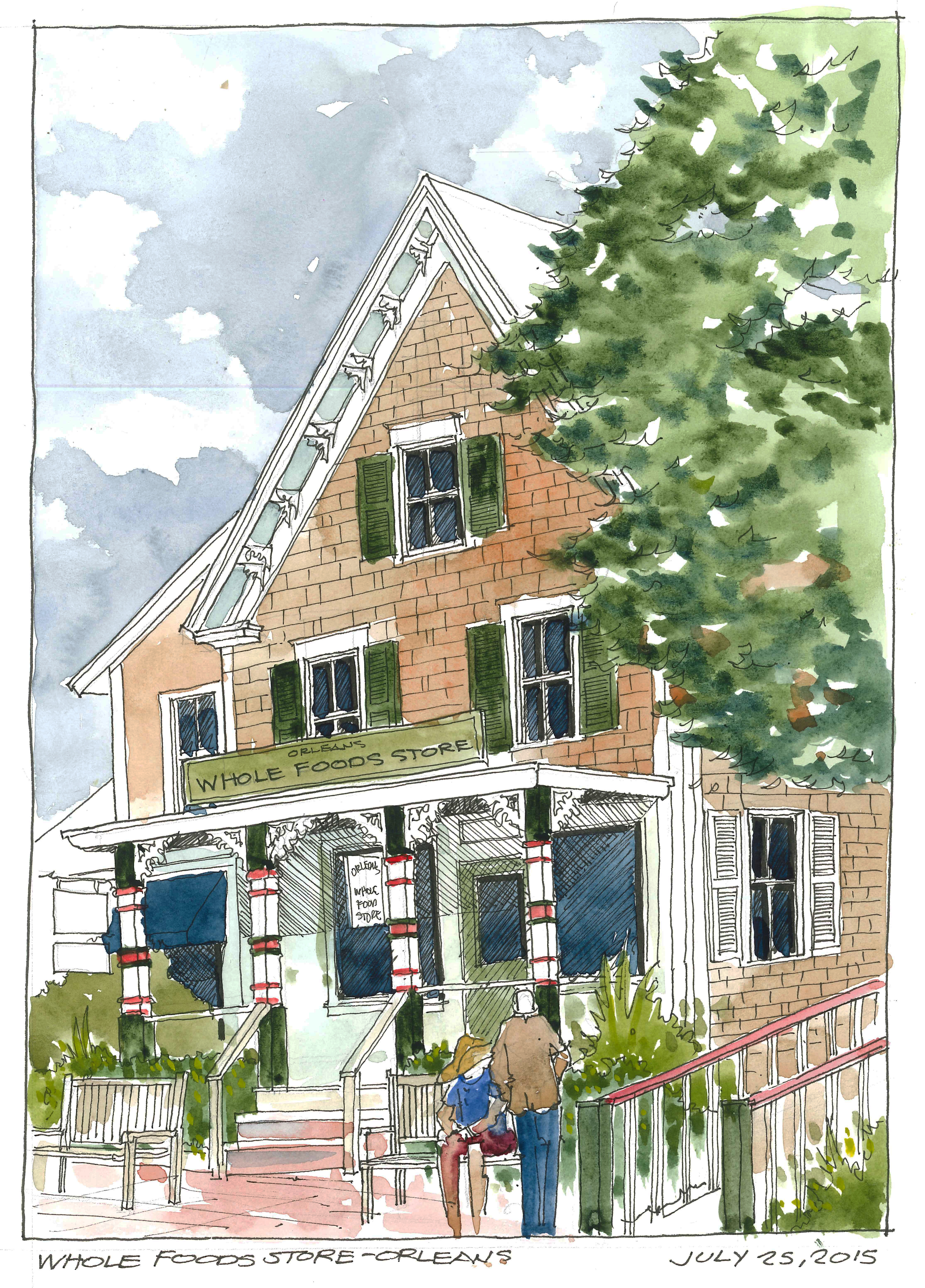 The flowers are amazing this time of year, especially on Cape Cod. It must be the cooler nights and the salt air moisture. This watercolor sketch is actually of one of the beds adjacent to yesterdays sketch of the Whole Food Store. The flowers are Blue Vine Flowers and Lavender. The lavender is so abundant on the cape this year. Maybe I am just noticing it more this year.