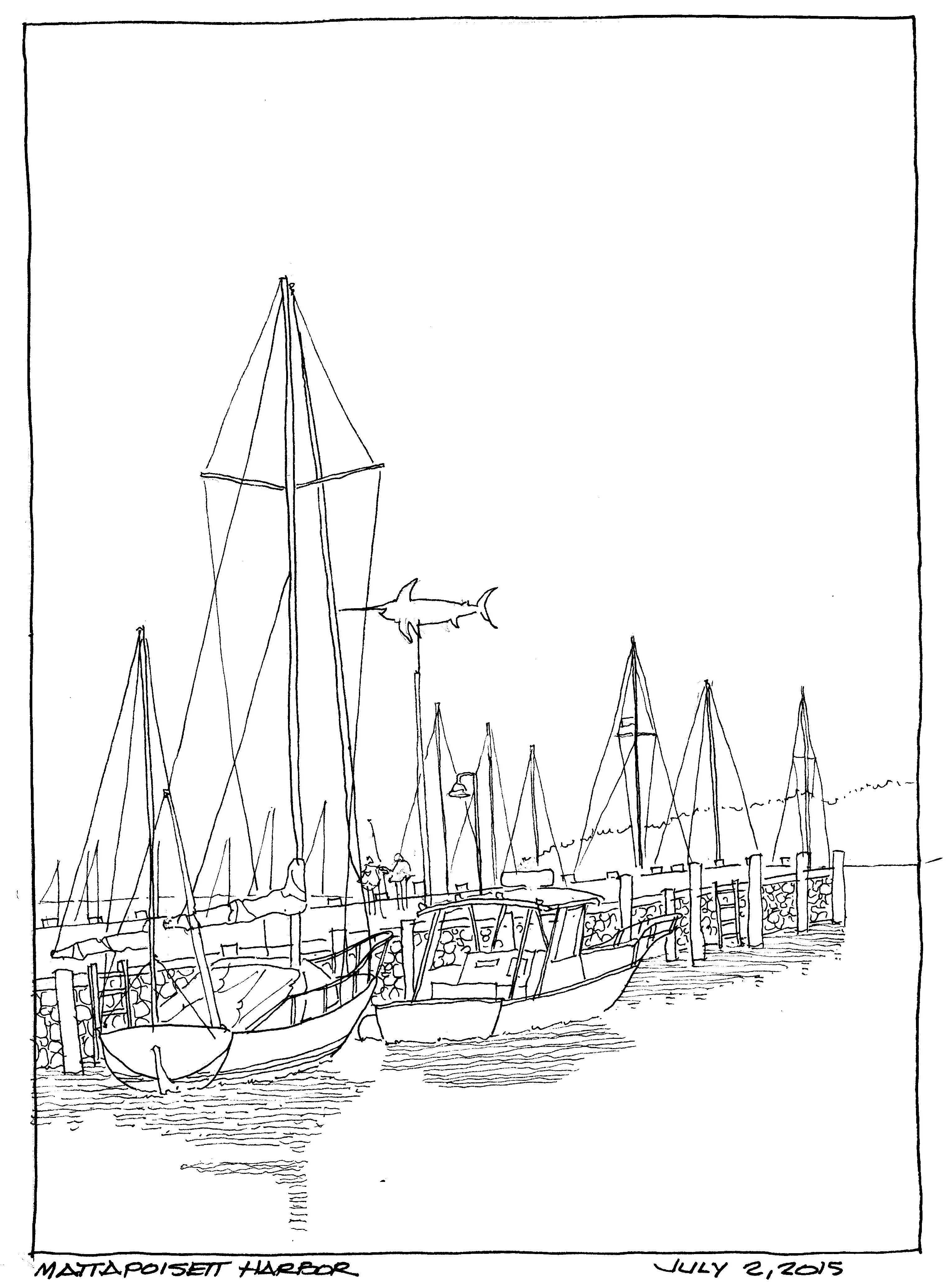 It is the start of a long 3 day weekend to celebrate Independence day in the United States. It looks like it is going to be a beautiful weekend and what better way than to kick it off with a ink sketch of Mattapoisett Harbor in Mattapoisett, MA. A sailboat and power boat tied up to the quay in anticipation of the weekend. Faber-Castell Pitt Art Pens in an Alpha Series Stillman and Birn Sketchbook.