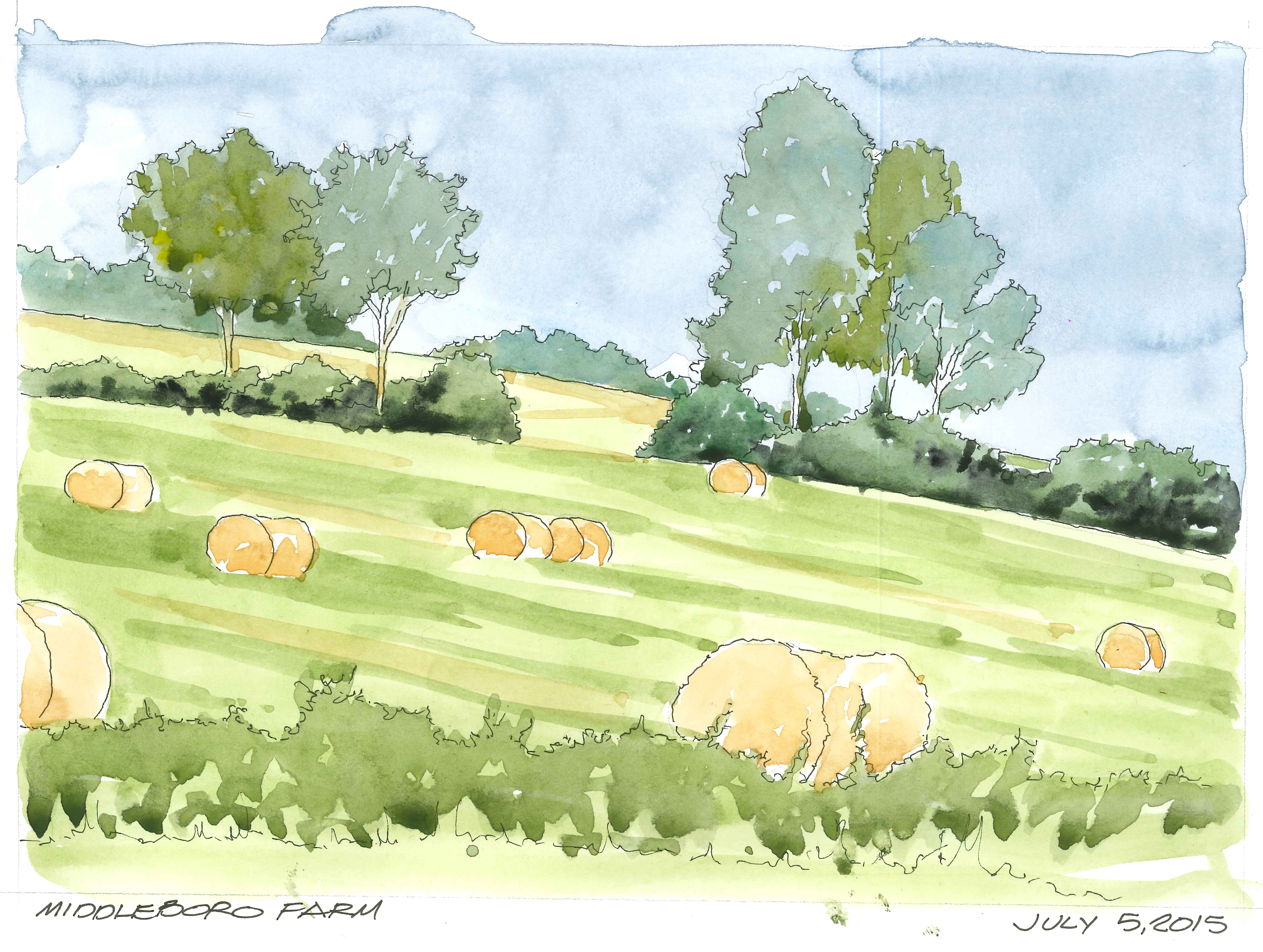 This bucolic hay farm is located on Grove Street in Middleboro, MA. The farm is beautiful with the rolling fields, tree lines and large rolled hay bails. I tried to simplify the drawing into simple shapes of color. Faber-Castell Pit Pen, Utrecht and Holbein Watercolors in an Alpha Series Stillman and Birn Sketchbook. Photo courtesy of Lisa Jacques.