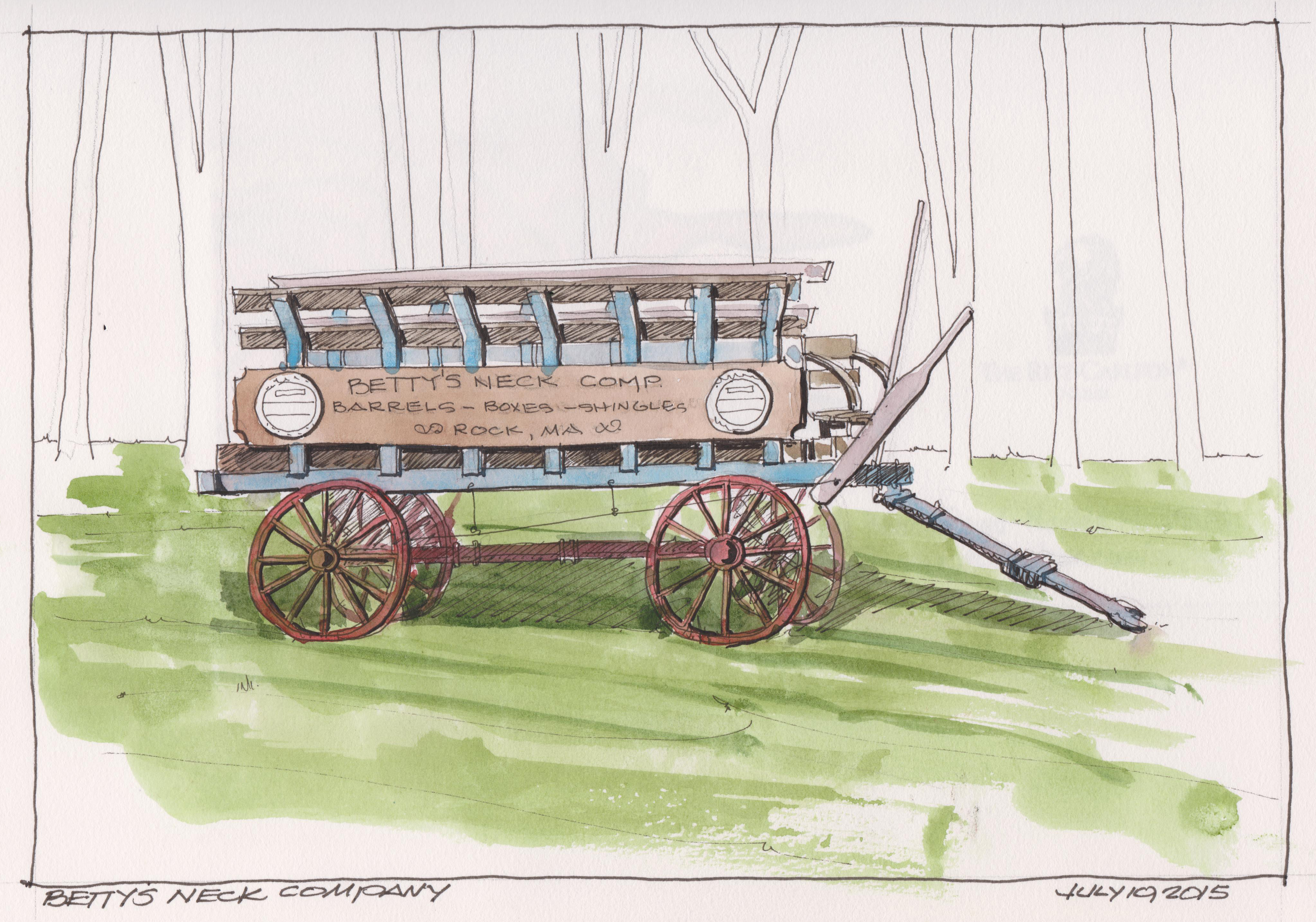 This Buckboard was located in front of a Elliot’s Farm Stand in Lakeville, MA. A Buckboard is an open, four-wheeled, horse-drawn carriage with seating that is attached to a plank stretching between the front and rear axles. Buckboards were typically used in rural areas from the 18th century until the early 20th century. An interesting subject but also very difficult to sketch and paint. This particular one has signs on the sides from Betty’s Neck Company, which is the original name of a Cranberry growing company founded by my wife’s relatives. Faber- Castell Pitt Art pens with Watercolor in a Stillman and Birn Alpha Sketchbook.
