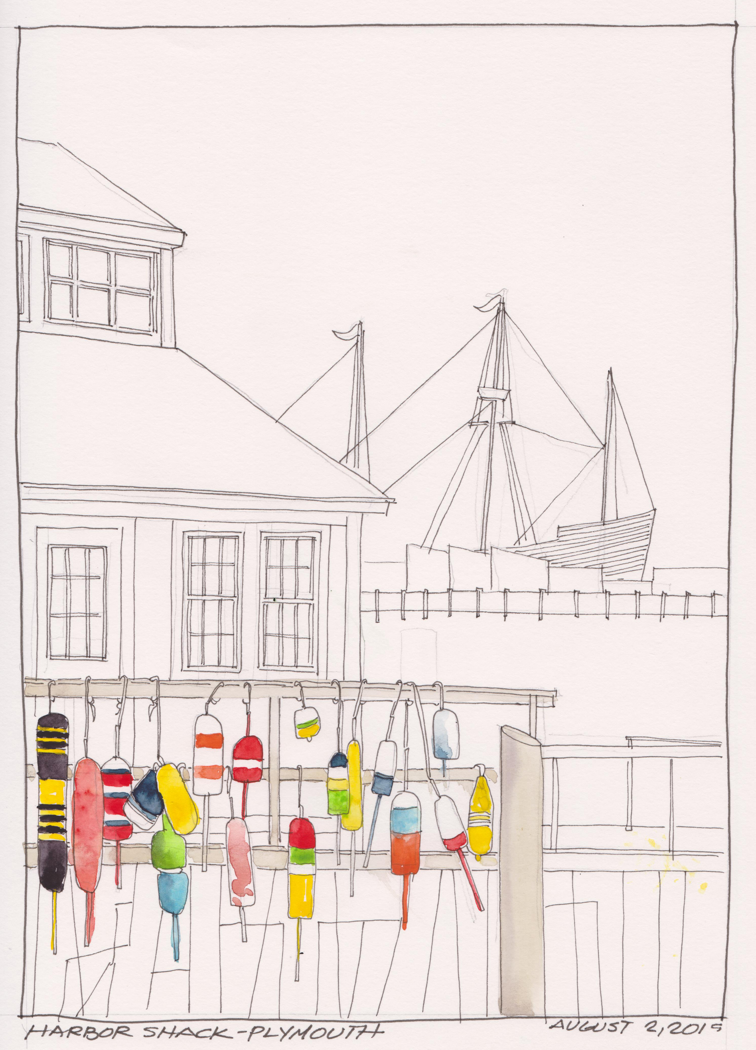 A great little vignette of a small shack on the docks of Plymouth Harbor, Massachusetts. The shack was very simple and the colorful lobster trap buoys caught my interest. In the background you can see the Mayflower ship that the pilgrams sailed over to the new world from England. Faber- Castell Pitt pens with watercolors in a Stillman and Birn Sketchbo0k.