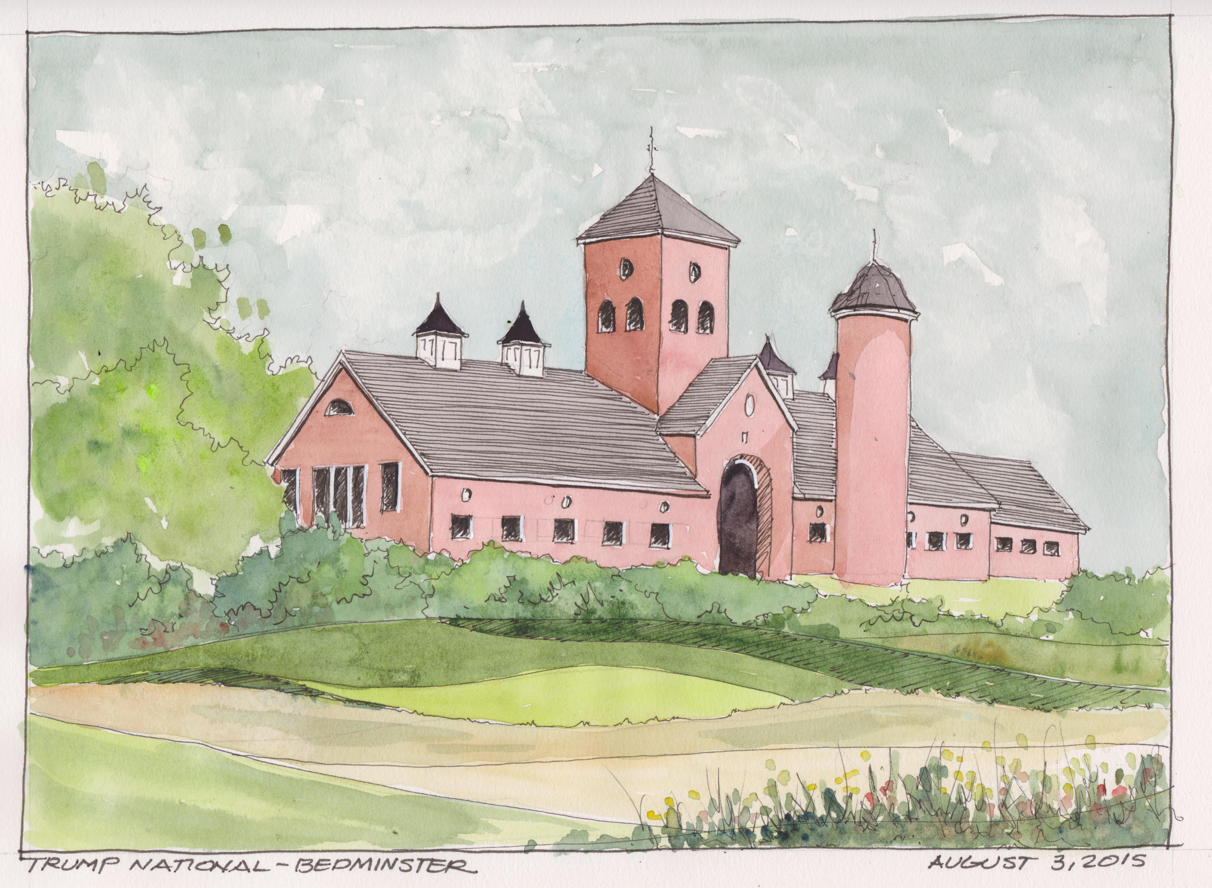 A fantastic day to play in a golf tournament at Trump National Bedminster, New Jersey. The Country Club in the former estate of John DeLorean of Automotive fame. Donald Trump bought the 434 estate in estate in 2000 and developed a PGA quality country club and course designed by Tom Fazio. This image is of the former horse stables. A stunning brick structure that is now part of the pool complex. Bedminster, New Jersey is a beautiful area with rolling hills and many horse farms, Faber-Castell Pitt pens and watercolors in a Stillman and Birn Alpha Series Sketchbook.
