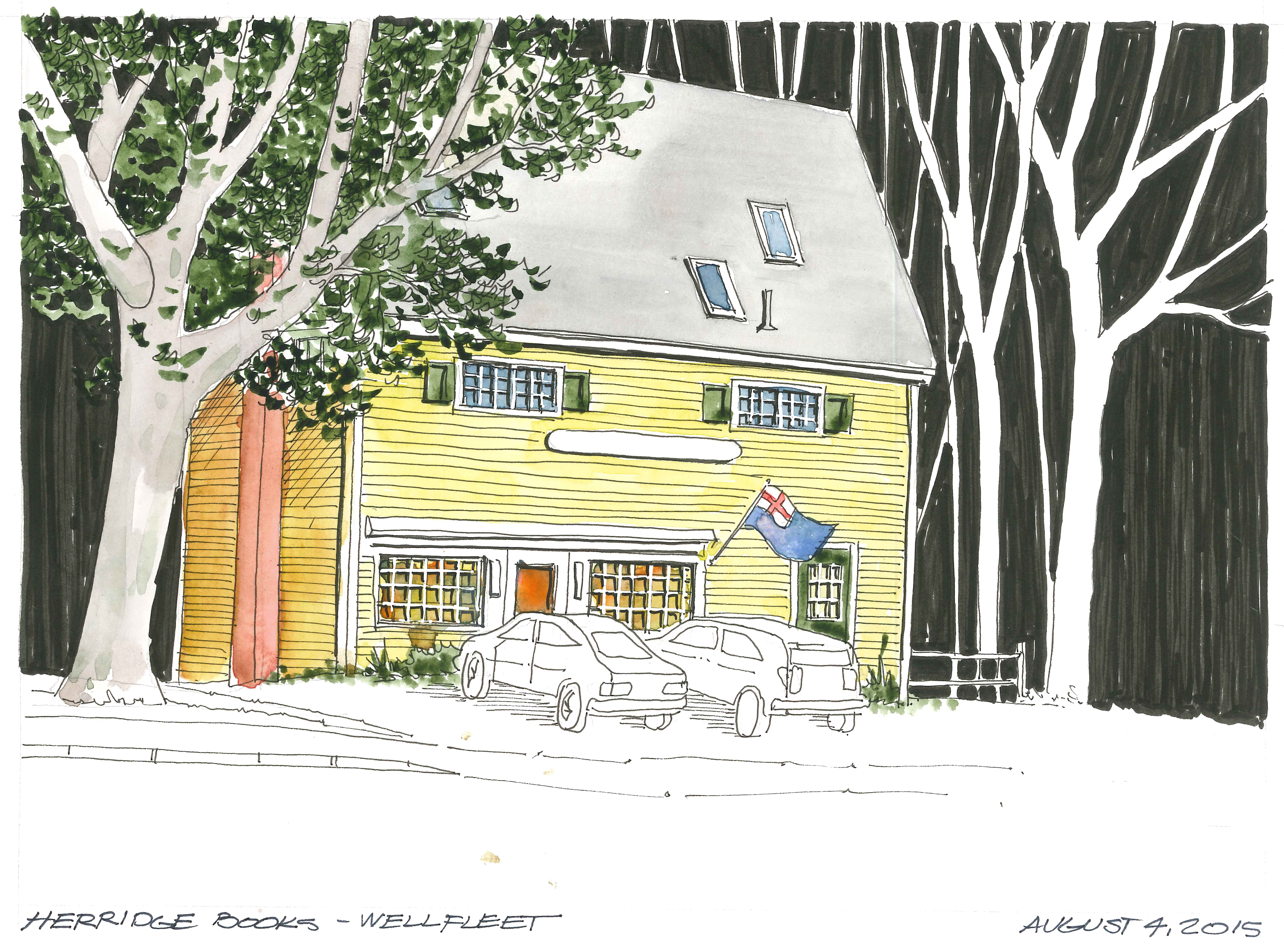 Herridge Books is located just out of the center of the small village of Wellfleet, Massachusetts. The Bookstore is in a small building and is the perfect store for a town that has been host to so many writers. This was sketched from a photo taken at dusk. The lighting was beautiful and how it made the façade glow. I did not even know how to capture that, so I did not try. Black Pitt Art Pens, Holbein watercolors in a Stillman and Birn Sketchbook.