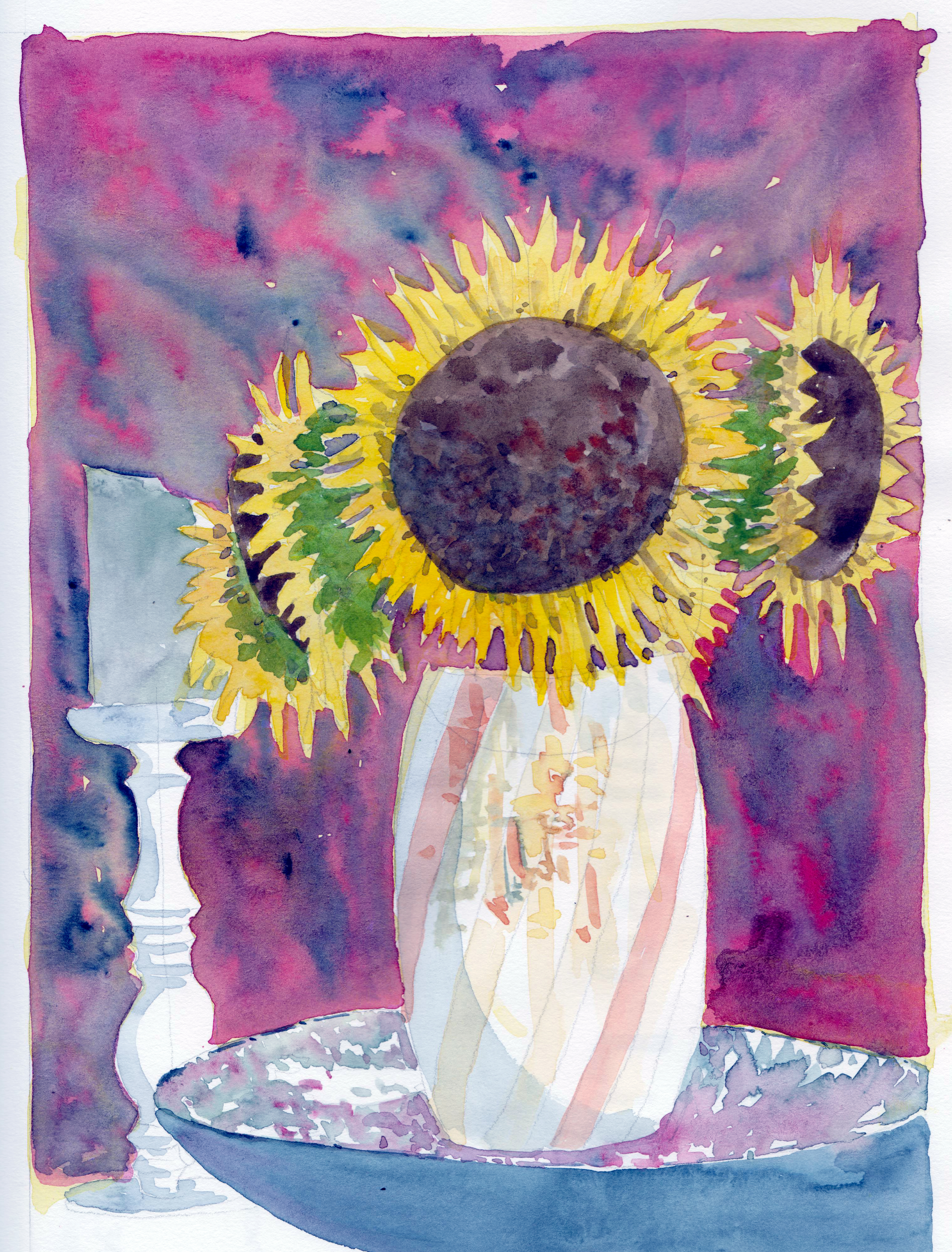 Sunflowers are like the sun itself. Bright, vibrant and cheerful. These sunflowers are in a glass vase on out dining room table and brighten up the room. The sketchbook paper does not take washes really well and it is difficult to mix intense colors on the paper. Holbein watercolors in an Alpha series Stillman and Birn sketchbook.
