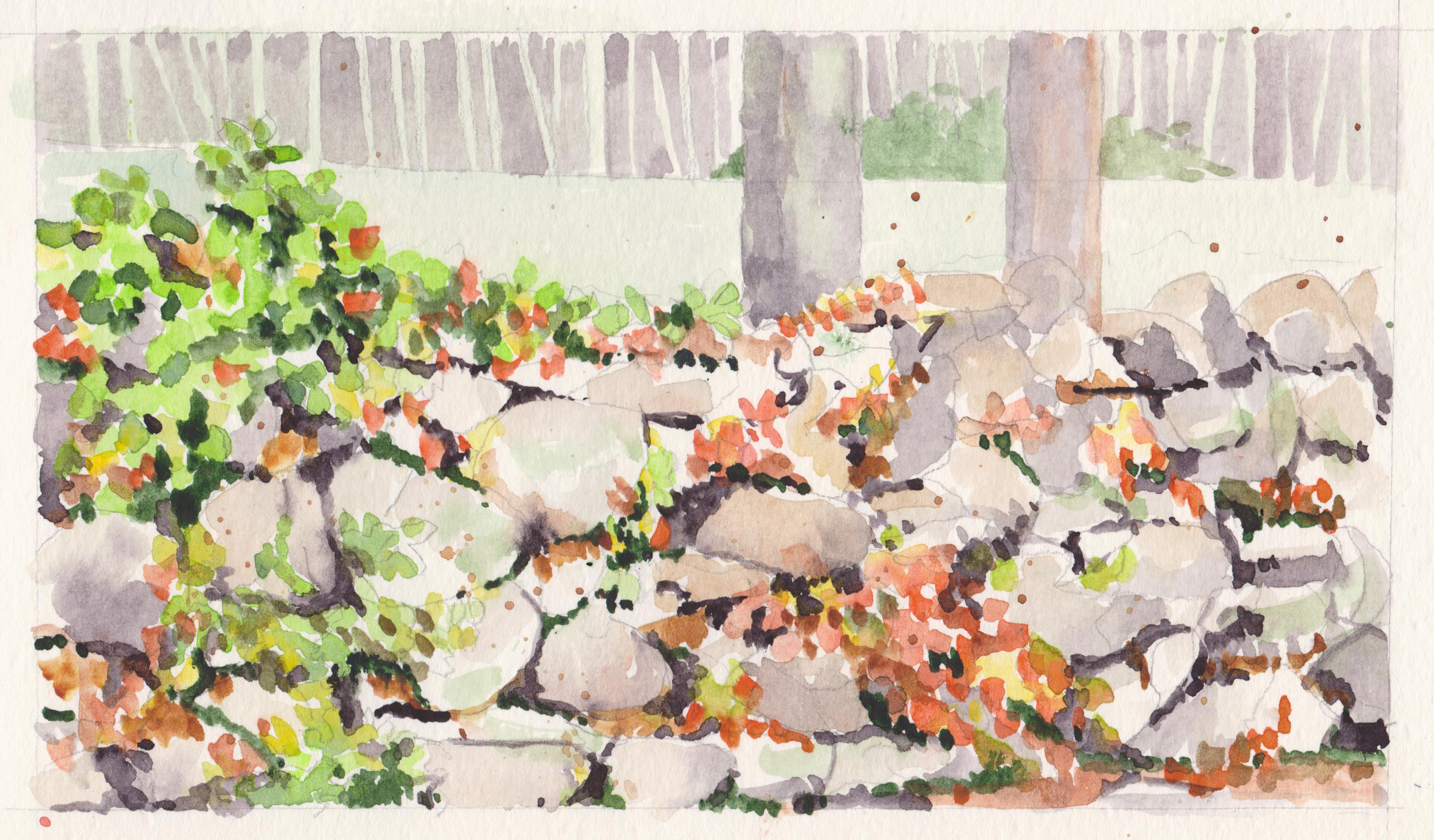 While it is not yet fall here in the Northeast, there are starting to be subtle signs that autumn is around the corner. This is a typical New England stone wall that the farmers constructed from all of the stones that they would plow up while working the fields. These walls would separate the fields and properties. This image shows the green ivies in the sunshine on the left transitioning to the yellow and oranges of fall foliage on the right in the shadows. Holbein and Daniel Smith watercolors in a 5″ x 8″ Moleskine watercolor book.