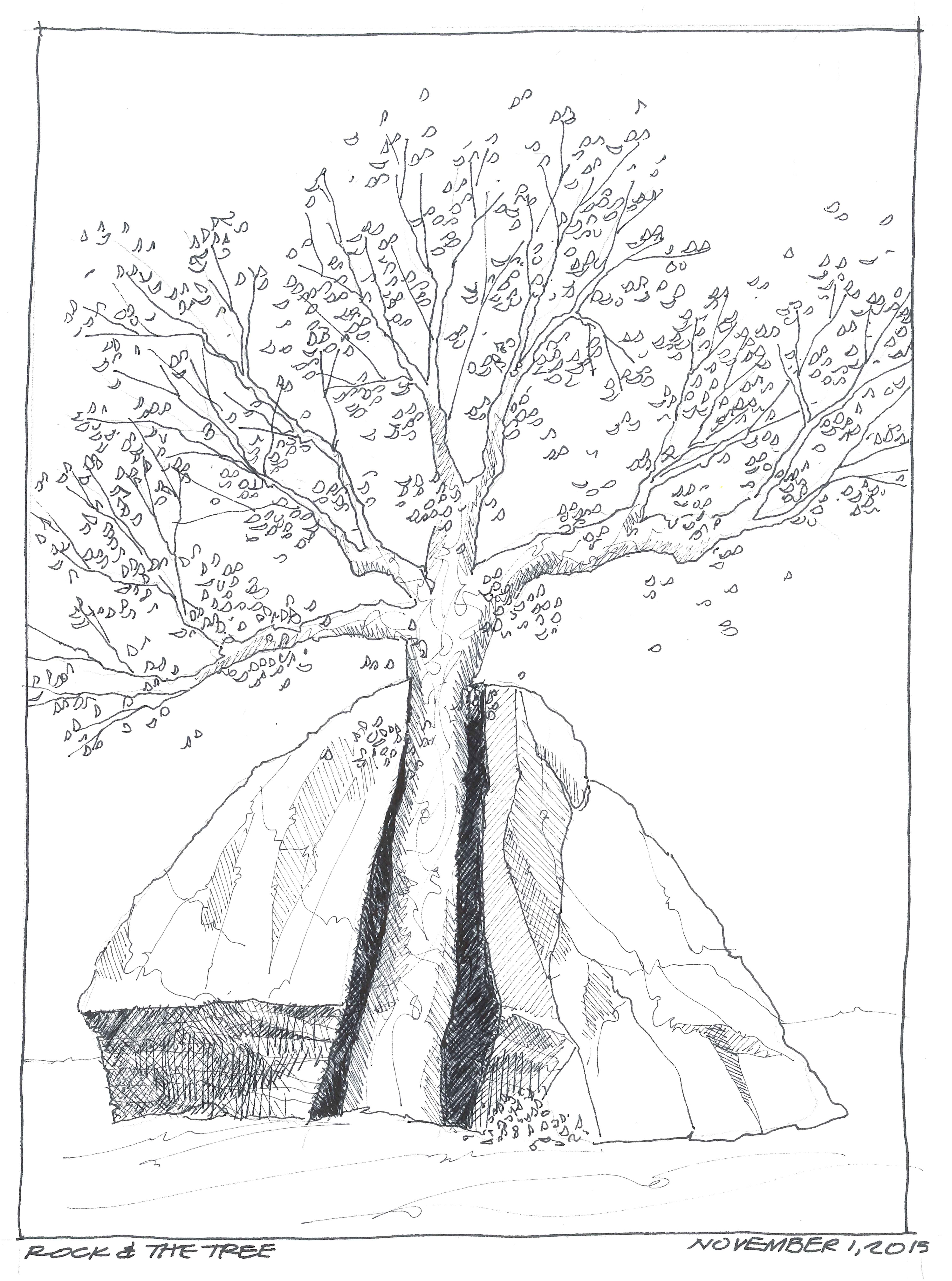 I think this is similar to the chicken and the egg. This sketch is of a large split rock and a tree growing in the gap. You cannot tell if the tree grew and split the boulder or if the boulder was split and the tree grew in the crack. The boulder is a perfect split like it was sawn in two. This is located in a parking lot adjacent to a fish and tackle store. Very interesting and wonderful the power of nature. Black Prismacolor Art Pens in a Stillman and Birn sketchbook.