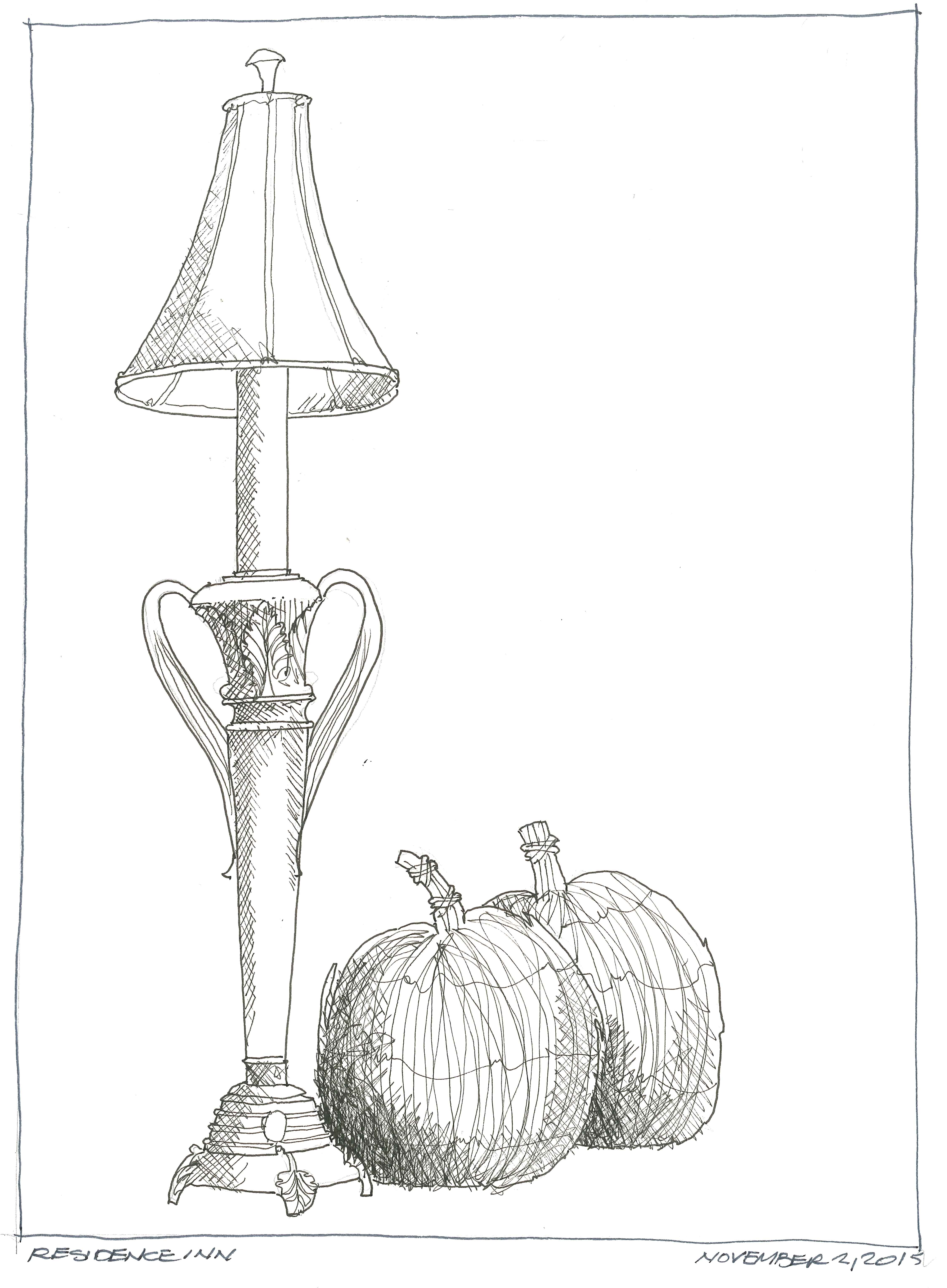 A very quick sketch of a lamp and raffia pumpkin on a table in the breakfast room at the hotel I was staying at. The lamp was detailed in bronze and the pumpkins were made of stiff raffia. Pilot Namiki Falcon fountain pen with Noodler’s black ink in a Stillman and Birn sketchbook.
