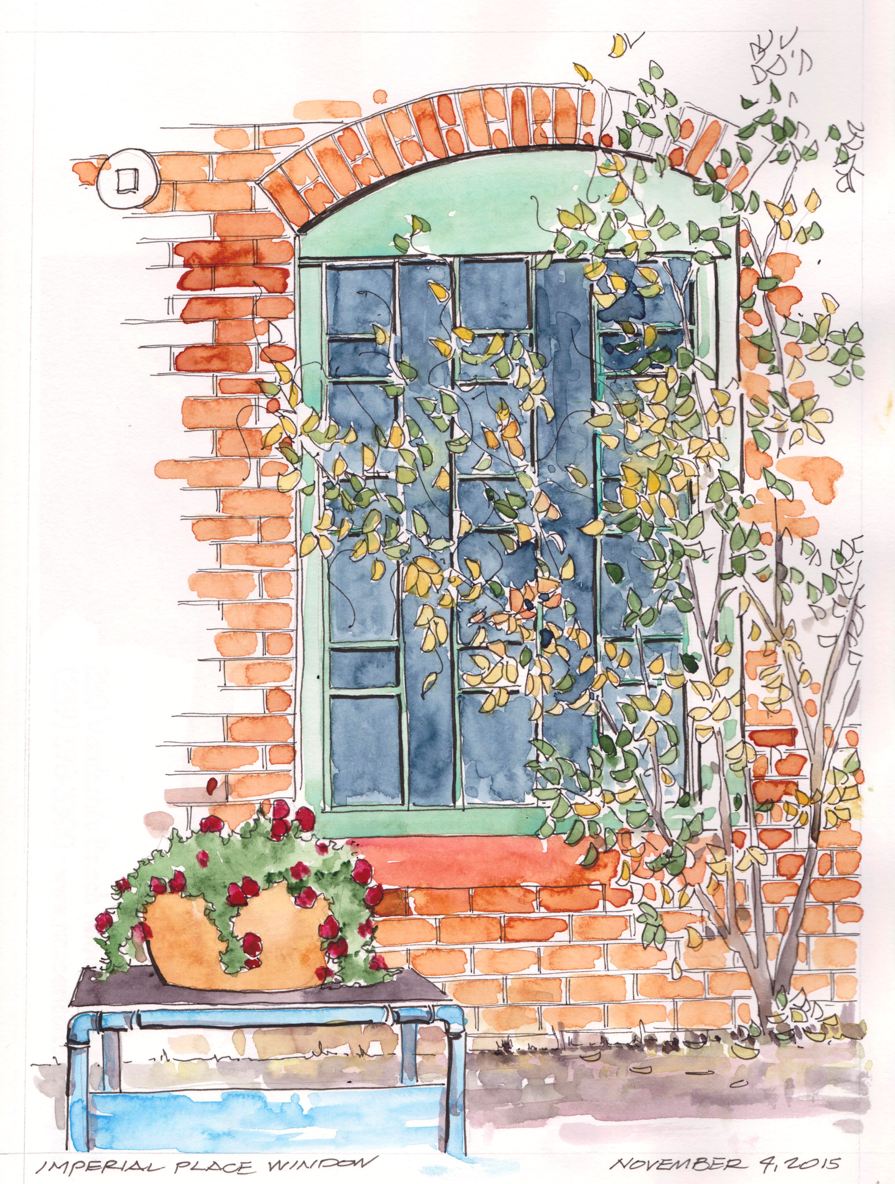 “A breeze, a forgotten summer, a smile, all can fit into a storefront window.” – Dejan Stojenovic A wonderful window set within a brick wall and encased in beautiful fall foliage. The small metal pipe bench held a terra cotta pot with bright petunias that are holding onto the last of the summer warmth. Faber-Castell Art pens with Holbein and Mission watercolors in an Alpha Stillman and Birn sketchbook.