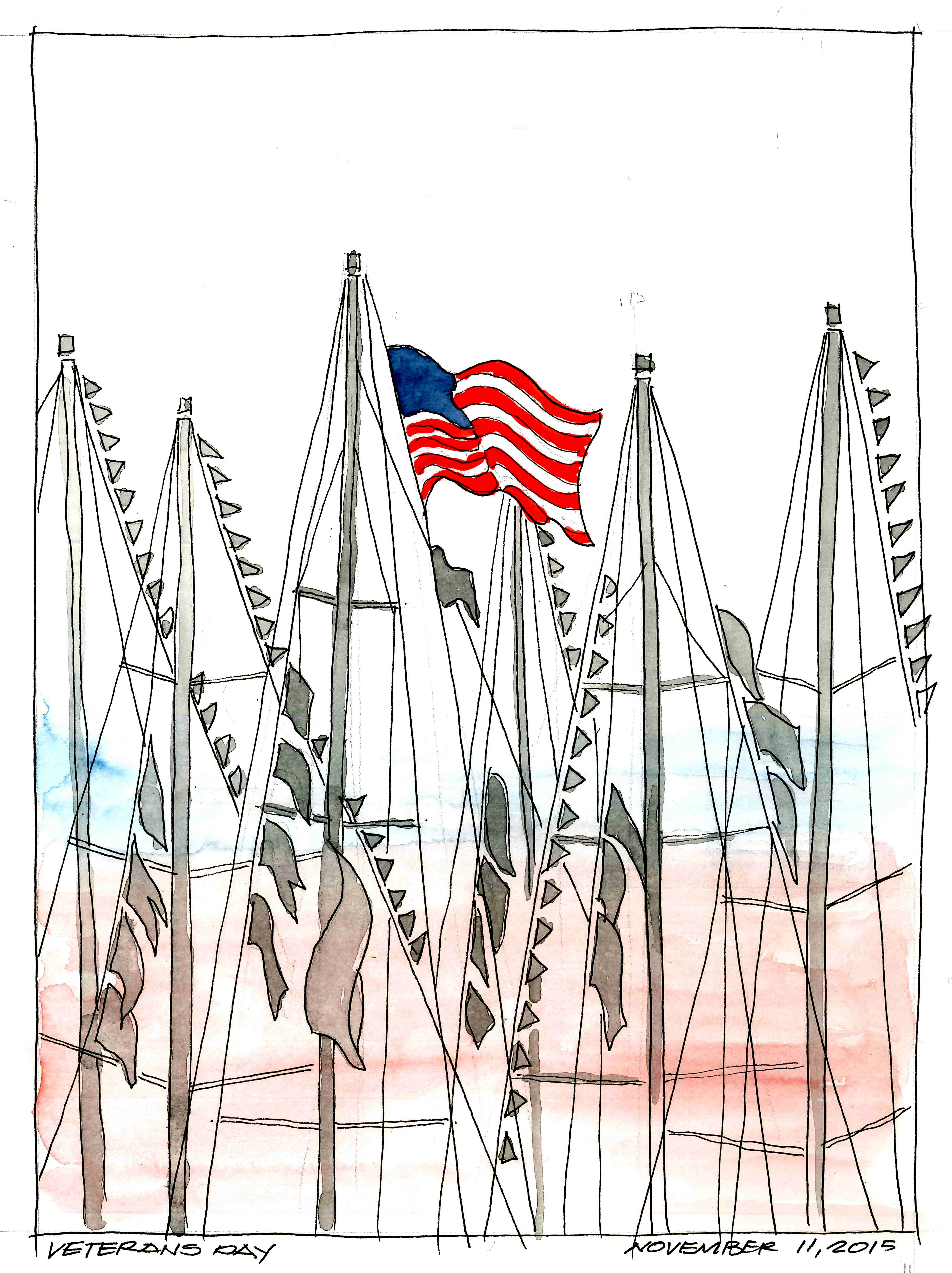 Veterans Day is an official United States public holiday, observed annually on November 11, that honors military veterans, that is, persons who served in the United States Armed Forces. It coincides with other holidays, including Armistice Day and Rememberance Day, celebrated in other countries that mark the anniversary of the end of World War I; major hostilities of World War I were formally ended at the 11th hour of the 11th day of the 11th month of 1918, when the Armistice with Germany went into effect. The United States previously observed Armistice Day. The U.S. holiday was renamed Veterans Day in 1954. This sketch is from a photograph from my friend Robin who works for the United States Coast Guard. Faber-Castel Pitt fine liner with Pelikan watercolors in a Stillman and Birn sketchbook.