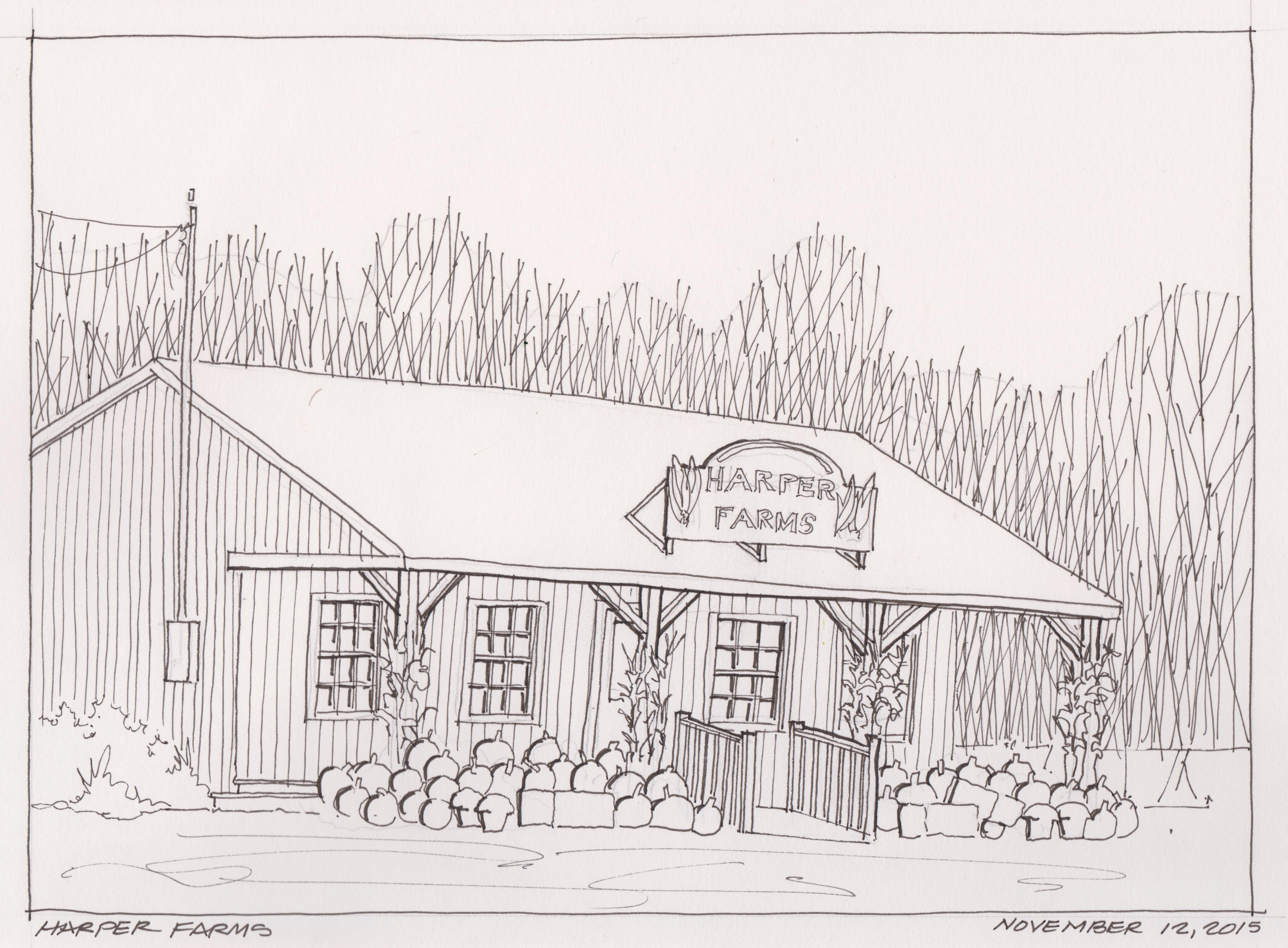 Harper’s Farm & Garden is a fourth generation family farm owned and operated by David Harper. The farm was originally located in Greenwich, MA and relocated to Lancaster, MA in 1903 by the great grandfather William Harper. This farm stand located on rte 117 in Lancaster, Massachusetts. The farm is displaying pumpkins and some late mums on the exterior late in the fall season. Lamy fountain pen with Noodler’s black ink in a Stillman and Birn sketchbook.