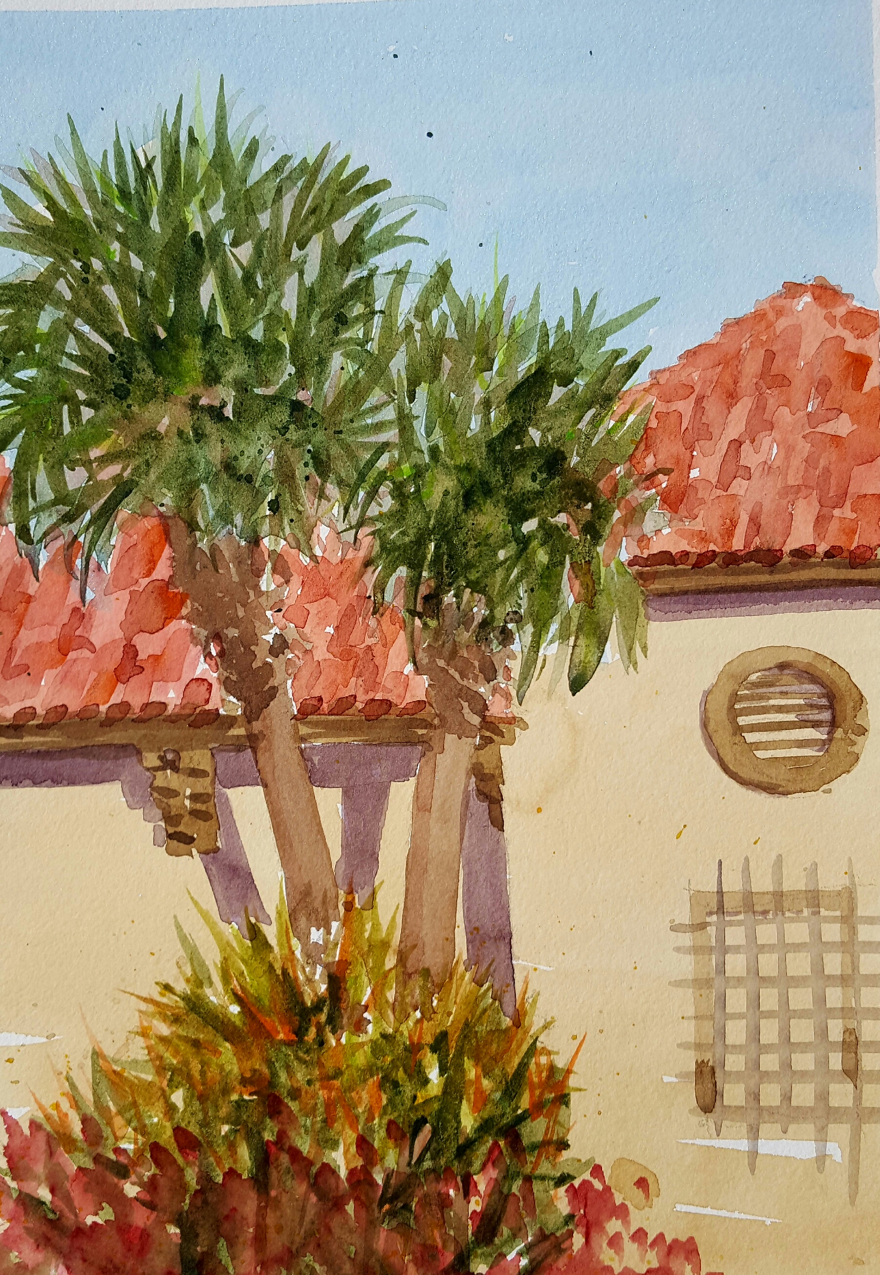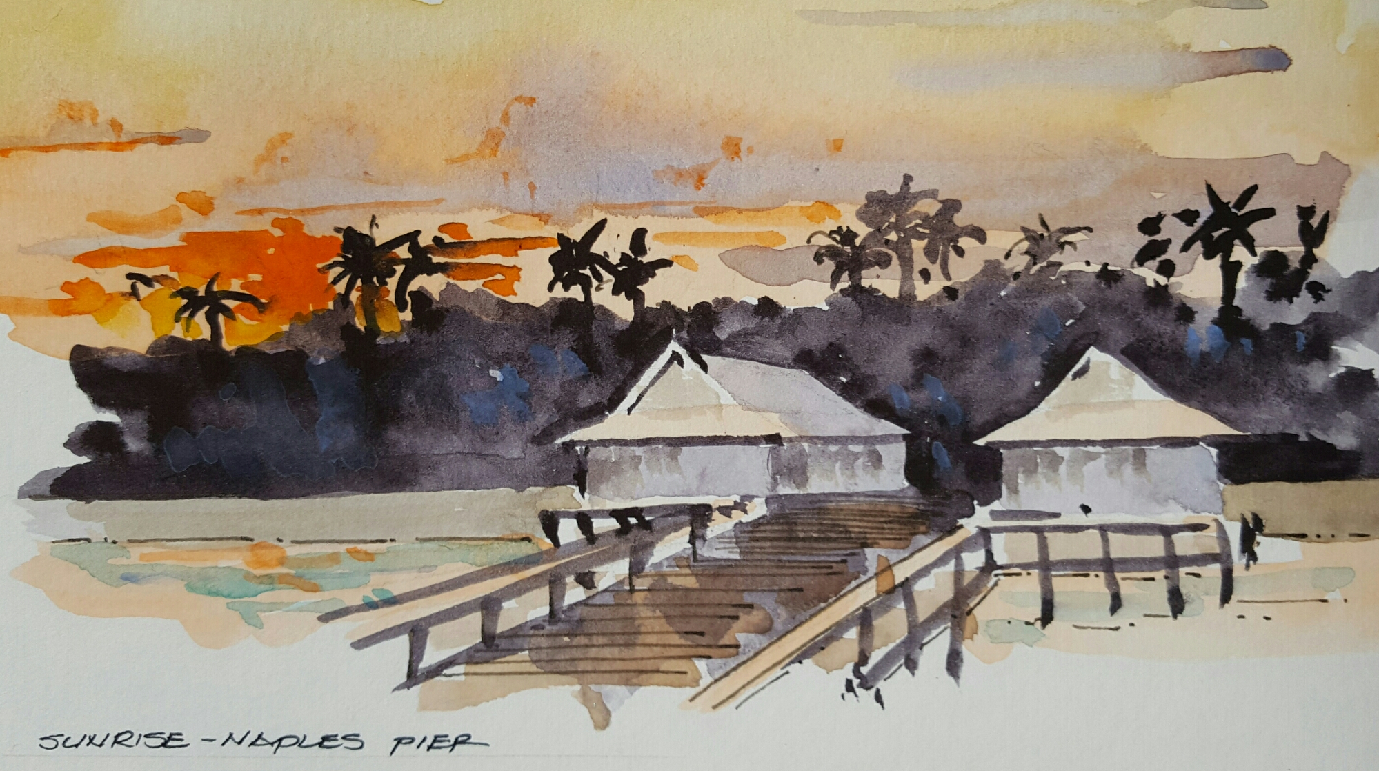A plein air watercolor of the historic Naples Train station. Once the rails were laid and the trains started to roll, the West Coast of Florida was opened up to visitors and developers. The building now houses a museum. Holbein watercolors on Fluid 140 pound Cold Press watercolor block.
