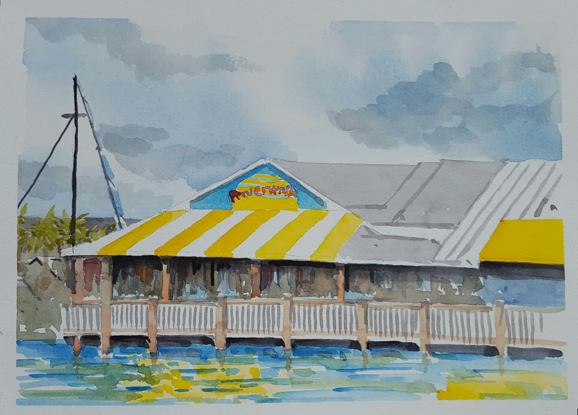Riverwalk May 2, 2016May 3, 2016waynejacques Plein Air watercolor of The Riverwalk Cafe as seen from across the river from Kelly’s Fish House. 1 hour with Holbein watercolors on Fluid 140 pound watercolor paper. 26.142036 -81.794810 Share this: Click to share on X (Opens in new window) X Click to share on Facebook (Opens in new window) Facebook Like Loading... Related