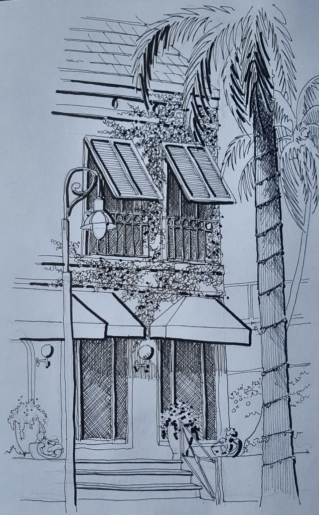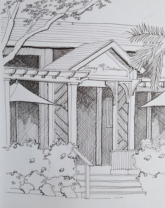 Pen and ink sketch of Tommy Bahama’s restaurant on 3rd Street South in Naples, Florida. Lamy Safari with Noodlers Bulletproof black ink and Faber Castell Pitt Art pens in a Stillman and Burn Beta sketchbook.
