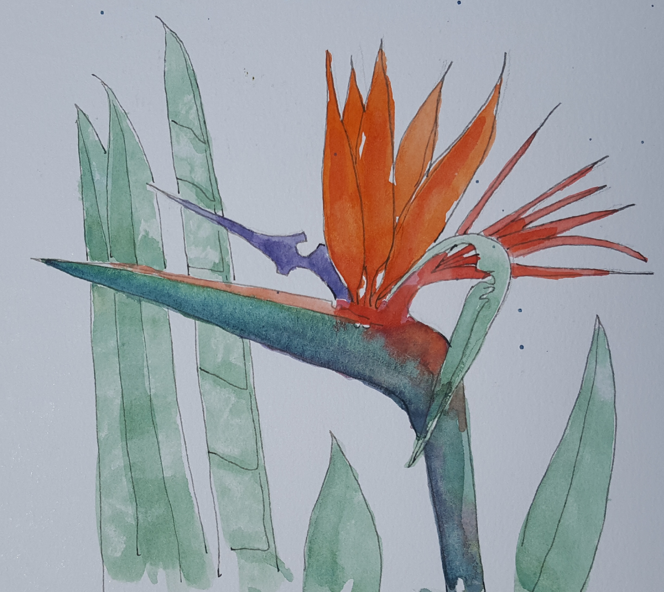 Watercolor and ink drawing of a Bird of Paradise flower. Such beautiful and different flowers. Holbein watercolors and ink lines in a Stillman and Birn Beta sketchbook .