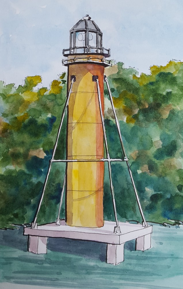 A watercolor sketch of the lighthouse at the entrance to Hamilton Harbor in Naples, Florida. Lamy Safari with Noodlers Bulletproof black ink and Holbein watercolors in a Stillman and Burn Beta sketchbook.