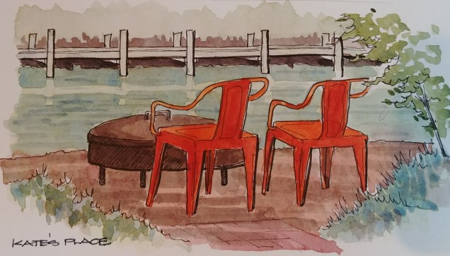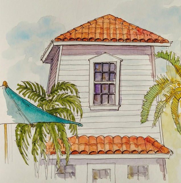 Watercolor sketch from the screen porch at Kate’s Place in Naples, Florida. Faber Castell Art Pens and Holbein Watercolors in a Still man and Birn Beta sketchbook.