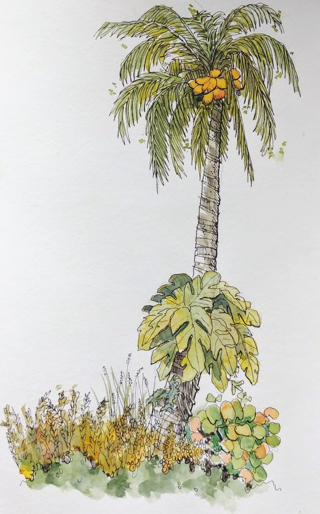 A drawing of a coconut palm and other greenery in the yard of the house we are staying at in Naples, Florida. Faber Castell Pitt Art Pens and Holbein Watercolors in a Stillman and Burn Beta Sketchbook.