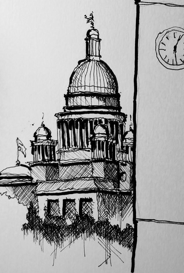 Pilot Namiki fountain pen with Noodlers black ink and Holbein watercolor highlights in a Stillman and Burn Beta Sketchbook.
